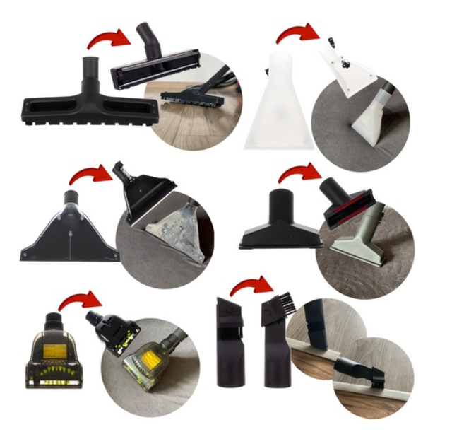 ЯК ПРАЦЮЄ ПИЛОСОС? - має систему із двох баків. Налийте в один з них воду та засіб для чищення, а в інший автоматично наповниться використана і брудна вода. Місткість бака для миючого засобу становить 3,5 літра, а ємність для брудної води після прання – 20 літрів. У наборі 6 насадок! Насадка для чищення підлоги Turbo призначена для чищення гладких поверхонь та килимів. Вона здатна видаляти стійкі забруднення, наприклад шерсть тварин, завдяки валику, що обертається, з синтетичними збираючими елементами. Вузька насадка з рухомим наконечником ідеально підходить для чищення кутів дивана, плінтусів, стель та інших затишних куточків. Невеликий Т-подібний наконечник ідеально підходить для чищення килимів, килимків та оббивки. Насадка для чищення з водяним розпилювачем, розпилювальний наконечник і щітка для підлоги.