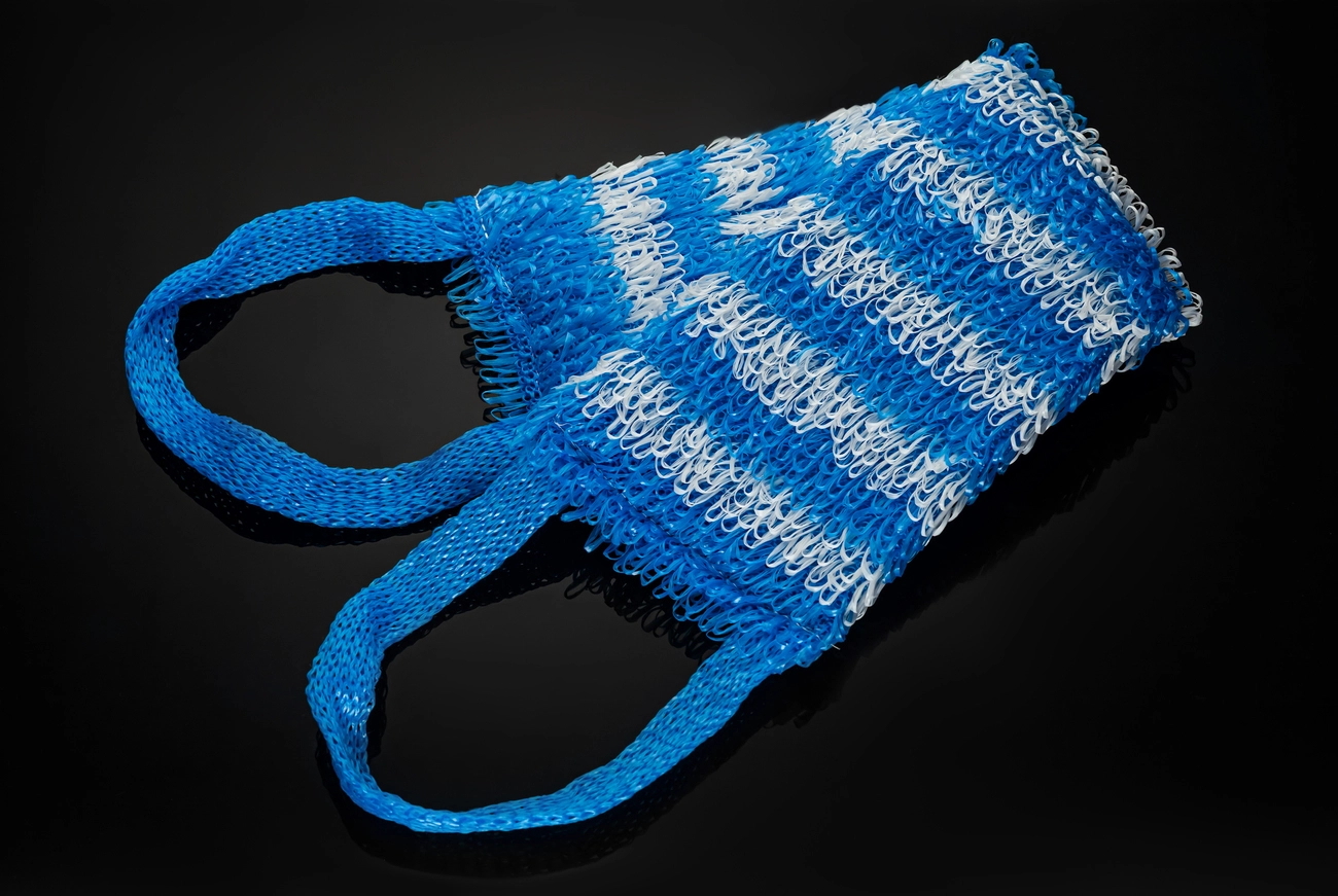 Мочалка банна з поліпропіленової нитки та поролону з ручками.