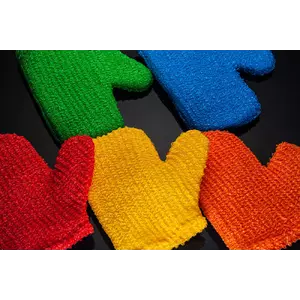 Рукавичка - ця мочалка зроблена у вигляді рукавиці. Усередині містить тонкі поролонові вставки, які створюють піну, і має петельку для зручності просушування після використання. Виготовляється з трохи завуженим манжетом для того, щоб при використанні та контакту з водою вона не злетіла з руки в процесі використання. Геометрія петель жаккарда в сукупності з різними комбінаціями ниток дозволяють виробляти виріб у всіх можливих ступенях жорсткості "Soft", "Medium", "Hard". Одягається по черзі на руки і використовується за призначенням.