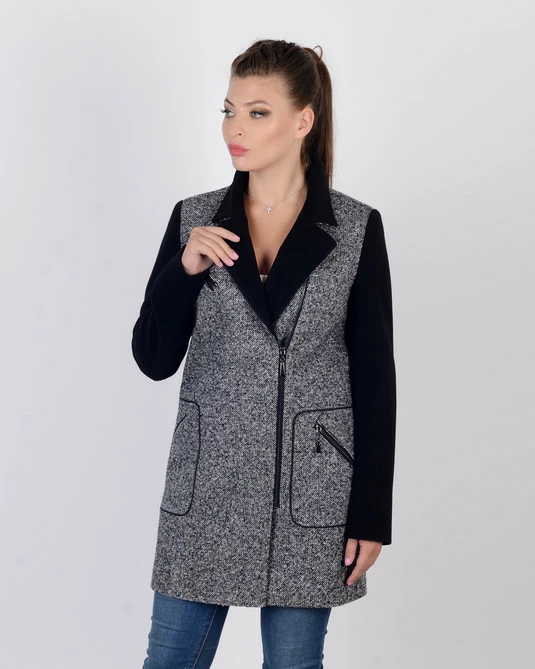 Полупальто твидовое, рукава и внутреняя часть ворота - кашемировые,ворот двубортный, на молнии. 2 прорезных кармана также на молниях. Выполнено из шерстяного итальянского твида, состав 20% синтетические волокна, 60% шерсть, 20% хлопка. подкладка вискозная. Длина изделия 85см, размерный ряд модели 42-52.