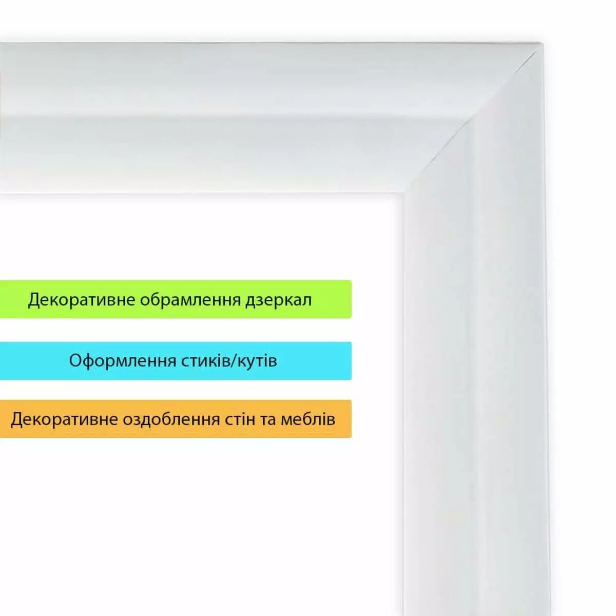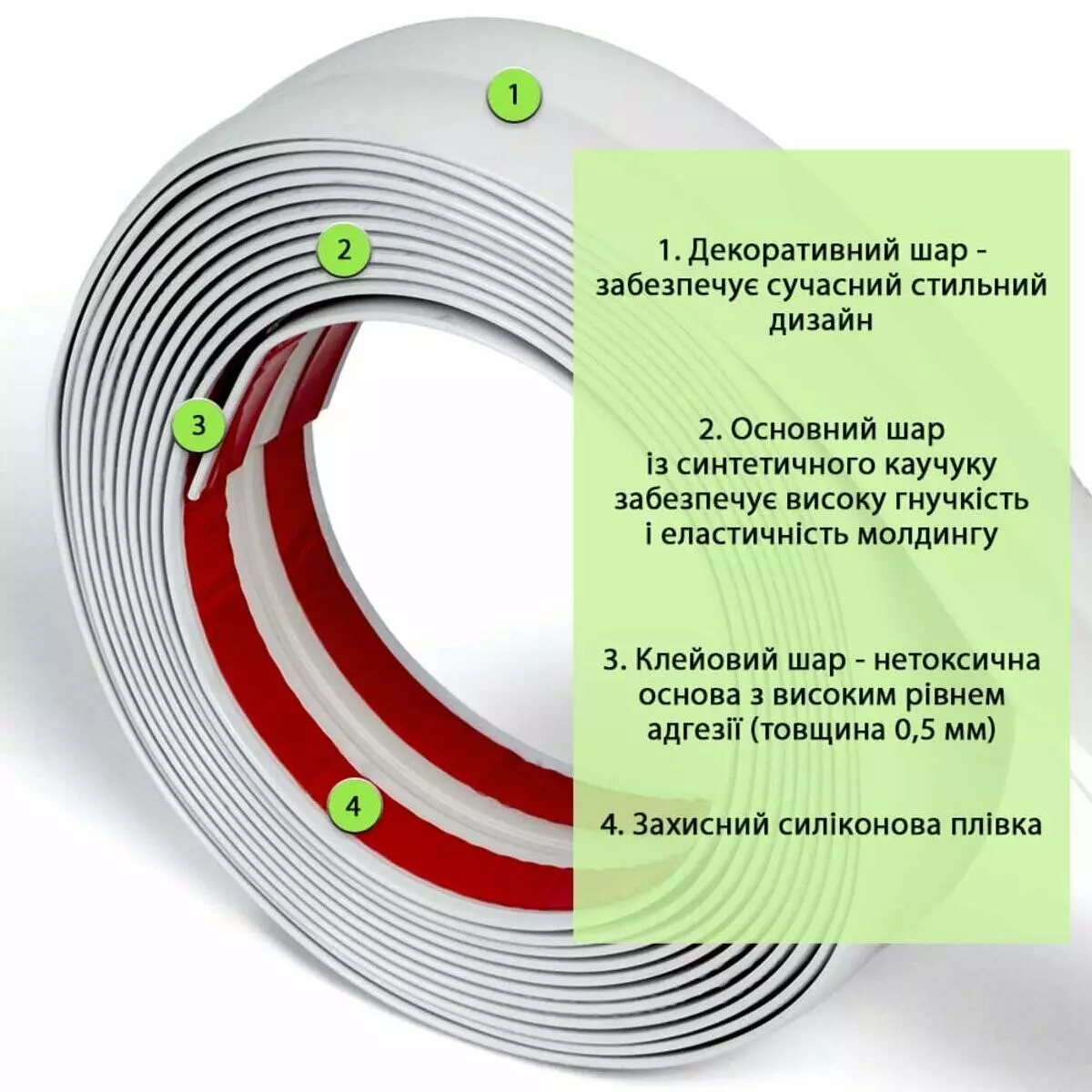 • Декоративний шар: відповідає за зовнішній вигляд молдингу — може мати різноманітні фактури та кольори, які забезпечують сучасний стильний дизайн.