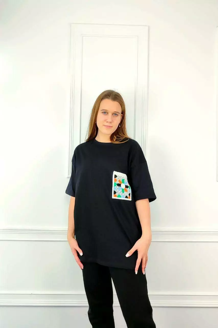 Молодежная женская футболка OVERSIZE 44-48 карман ромашка Чёрный