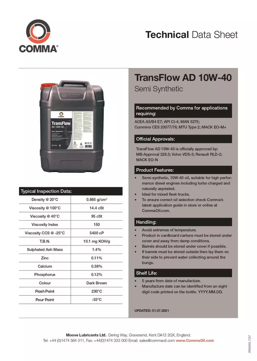 Моторное масло Сomma TRANSFLOW AD 10W-40 API CI-4; ACEA A3/B4/E7 20л (1шт/уп)