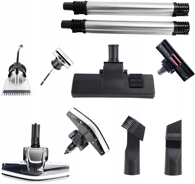 Часто пылесосы поставляются с минимальным количеством аксессуаров, что ограничивает их функциональность. Наш пылесос оснащен широким набором насадок и фильтров, включая насадку для обивки, щелевую насадку 2 в 1 и многое другое, что делает любой вид уборки простым и удобным.