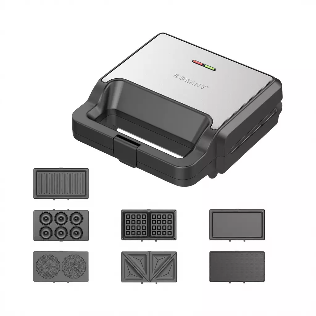 Мультипекар Sokany SK-08137 призначений для приготування випічки та закусок різних типів. У комплект входять сім змінних пластин з антипригарним покриттям, що підходять для приготування сендвічів, вафель та інших страв без прилипання. Корпус виконаний із пластику з елементами з нержавіючої сталі, що спрощує догляд.
