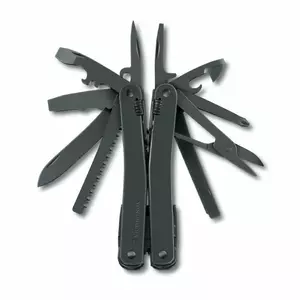 В компактну конструкцію виробу включені інструменти, призначені для особистої гігієни (пилочка для нігтів, скребок), а також безліч пристосувань побутового призначення (консервний ніж, хрестова викрутка, плоскогубці, шило, лінійки різних розмірів і т. д.). З появою Victorinox Swisstool поняття про можливу багатофункціональності складного ножа істотно розширилося. Представлена модель стане оптимальним рішенням для тих, кому раніше не вистачало деяких опцій в комплектації улюбленого портативного аксесуара. Зручність та легкість експлуатації, а також безпеку використання гарантується особливим механізмом, з вбудованим замком U-lock. Традиційним для швейцарського ножа Victorinox, матеріалом виготовлення виробу послужила нержавіюча сталь високої якості, стійка до широкого ряду руйнівних факторів, серед яких: негативний вплив вологи, згинання і деформація інструментів, внаслідок механічного впливу. Функціональна насиченість Викторинокс Свизтул гармонійно збалансована стриманим дизайном. Оформлення корпусу, як і самих окремих інструментів, представлено чорним матовим покриттям, яке, в силу застосування інноваційних технологій, відрізняється високою практичністю і зносостійкістю. Приємним сюрпризом для покупців представленої моделі ножі Victorinox стане наявність таких унікальних інструментів, як пила і напилок по металу, інструмент для зняття ізоляції, пристрій для перекушування твердої дроту, щипці для виконання робіт з електричними проводами. Для багатьох користувачів ці інструменти можуть виявитися справжньою знахідкою! Багатофункціональний інструмент володіє особливим типом клинка – Drop Point. Ножі такого роду широко затребувані серед людей, що активно займаються туризмом. Мультитул Victorinox Swisstool важить всього 208 гр. і не вимагає багато місця для зберігання.