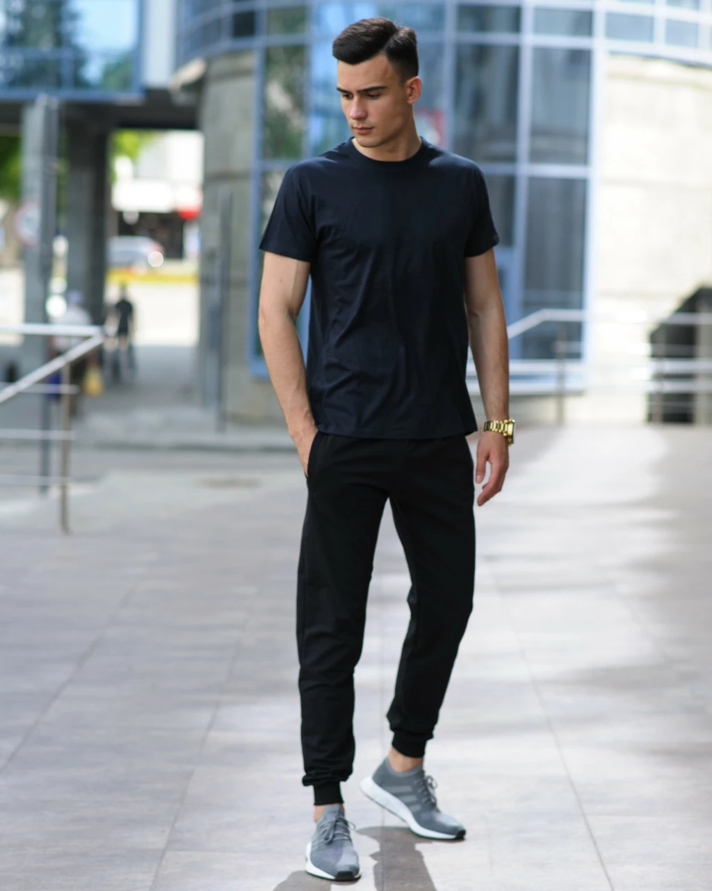 Мужской комплект - черные спортивные штаны и футболка хаки (весна/лето/осень)