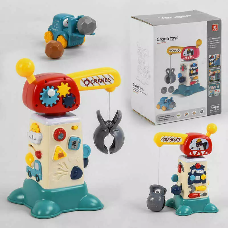 Музична гра 2158 (12) “Вантажопідйомний кран”, світло, звук, машинка, 4 гральні камінці, тріскачка, англійська озвучка, в коробці