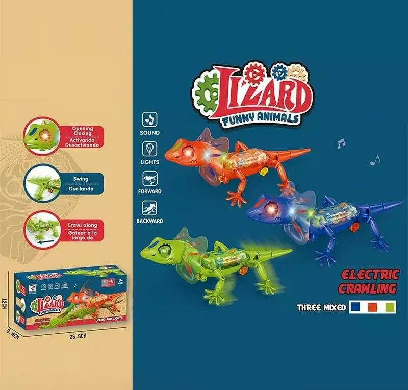 Музична ящірка ZR 155 (72/2) 3 кольори, підсвічування, довільний рух, мелодія, рухливі кінцівки, шестерні, в коробці, ВИДАЄТЬСЯ ТІЛЬКИ МІКС ВИДІВ