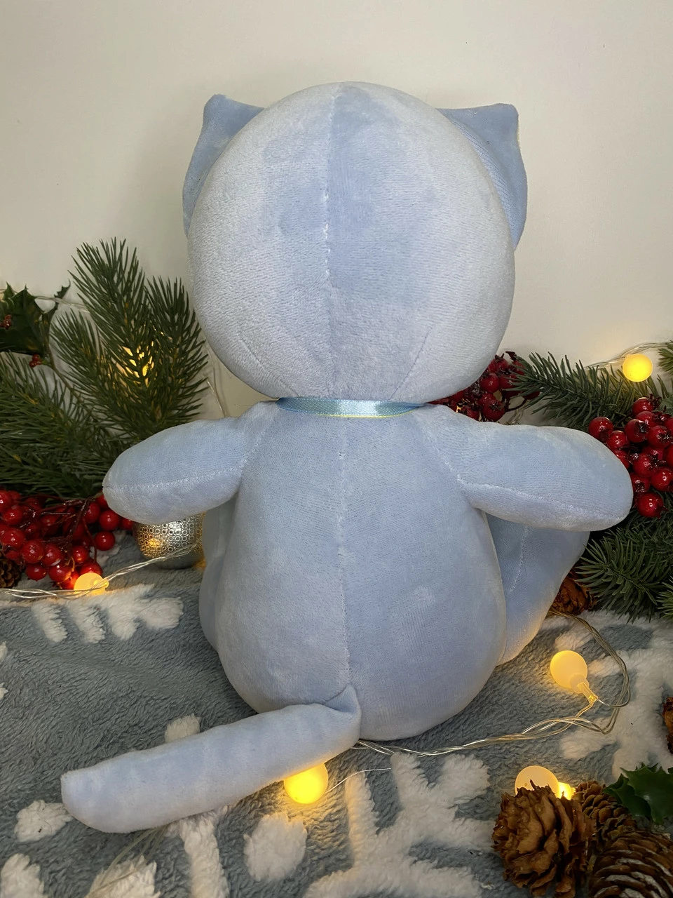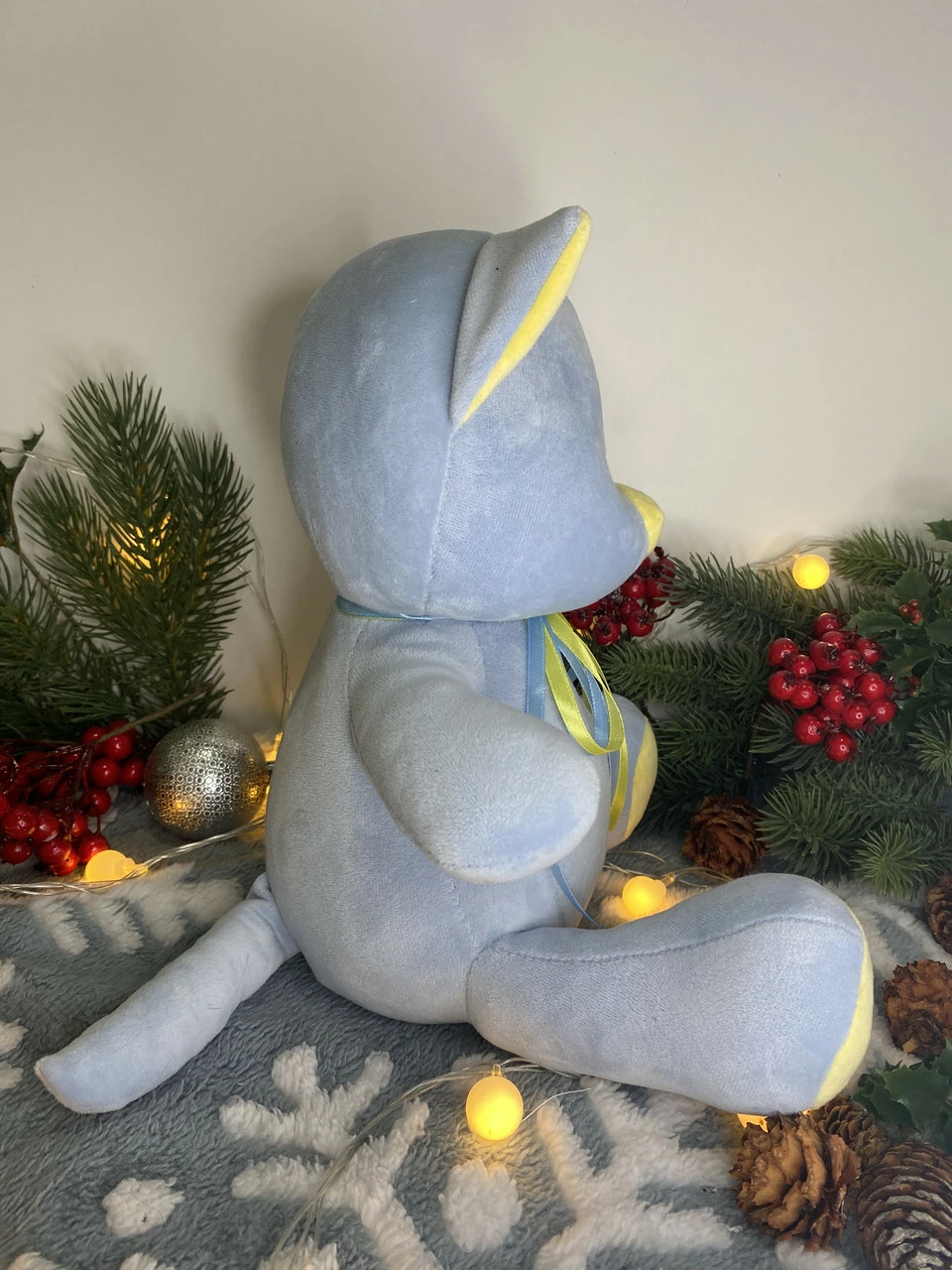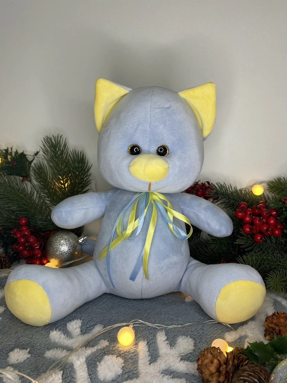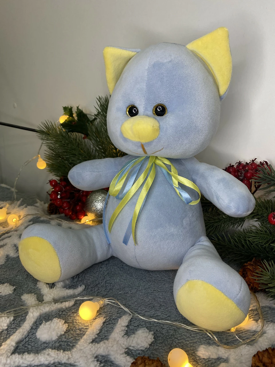 Игрушка изготовлена из качественных материалов, мягкая и приятная на ощупь. Желто-голубого цвета. Размер 33 см.