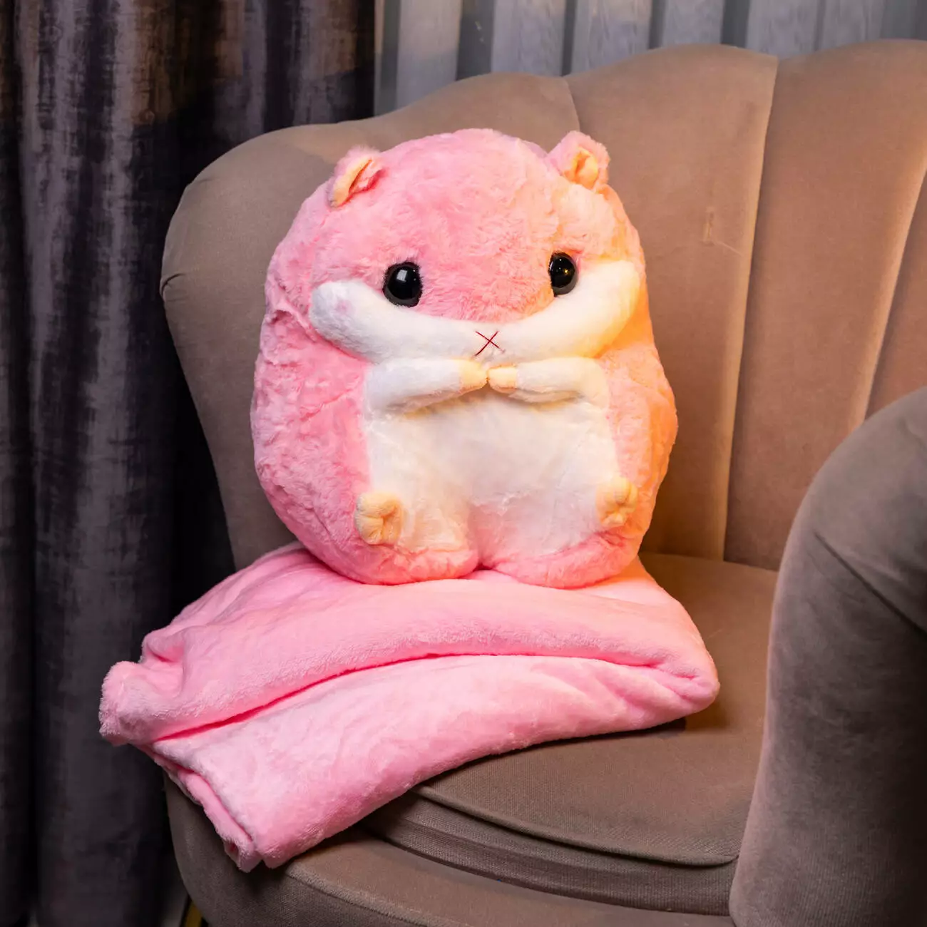 М'який плюшевий хом'ячок з потайною кишенею-блискавкою на спинці для зберігання теплого пледа ідеальний для дому, машини та подорожей, і як подарунок дитині або любителю милих речей. М'який та безпечний матеріал підходить для ігор та сну, а плед досить великого розміру підходить для дітей та дорослих, зігріє взимку та створить затишок у поїздці.