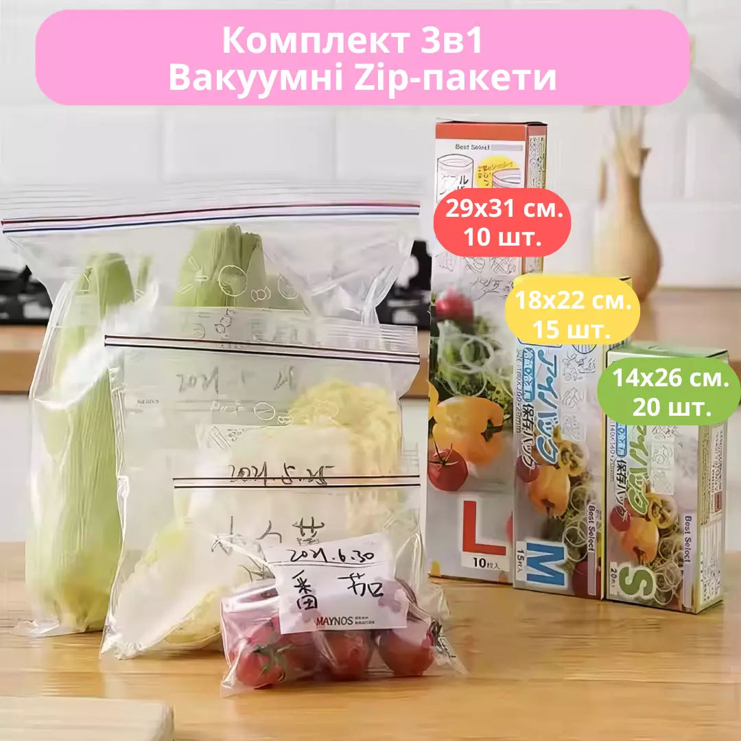 Комплект із 3 розмірів вакуумних Zip-пакетів стане ідеальним