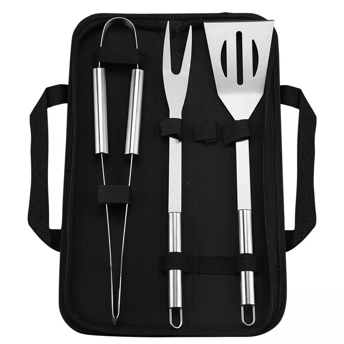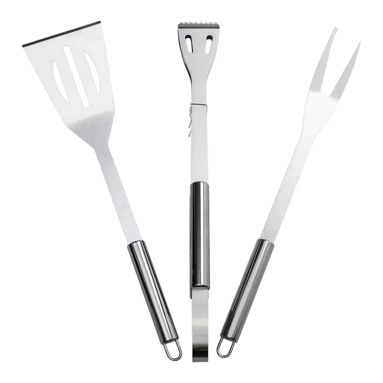 Набір приборів для барбекю складається з трьох предметів, виготовлених із нержавіючої сталі. У комплект входять вилка для м'яса, лопатка та щипці. Кожен інструмент має подовжену ручку для зручності під час приготування на грилі.