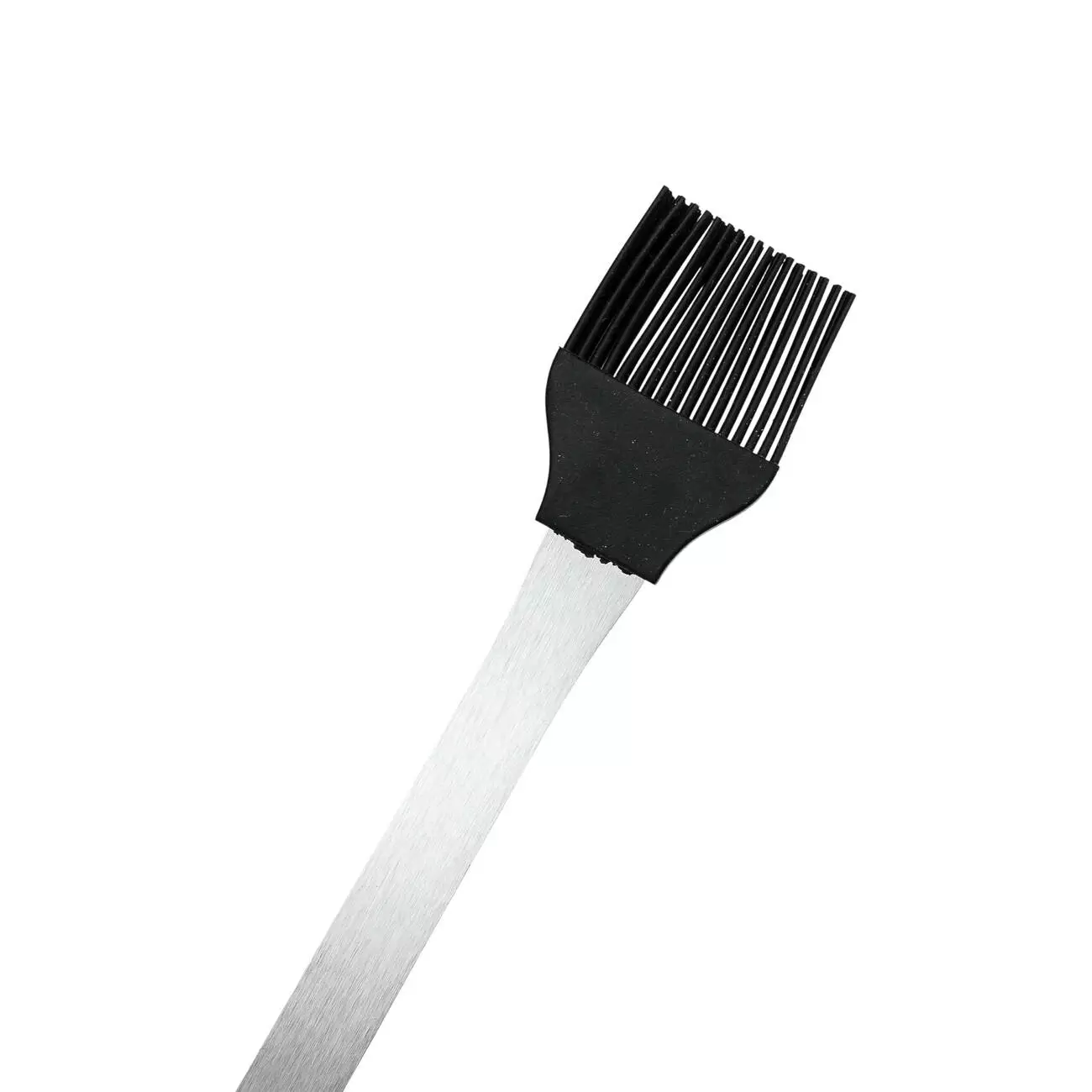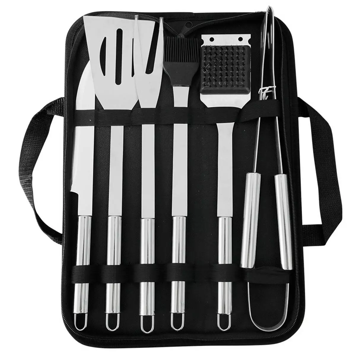 Набір приборів для барбекю складається з 6 предметів, виготовлених із нержавіючої сталі. У комплект входять ніж, лопатка, вилка для мяса, щипці, пензлик силіконовий, щітка для чищення. Кожен інструмент має подовжену ручку для зручності під час приготування на грилі.
