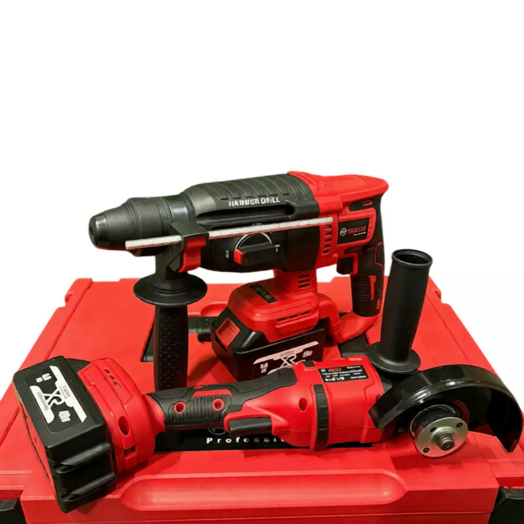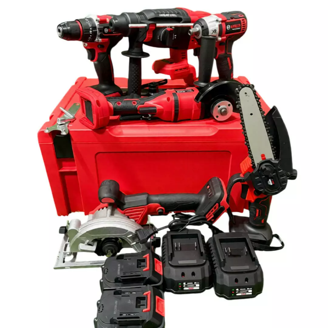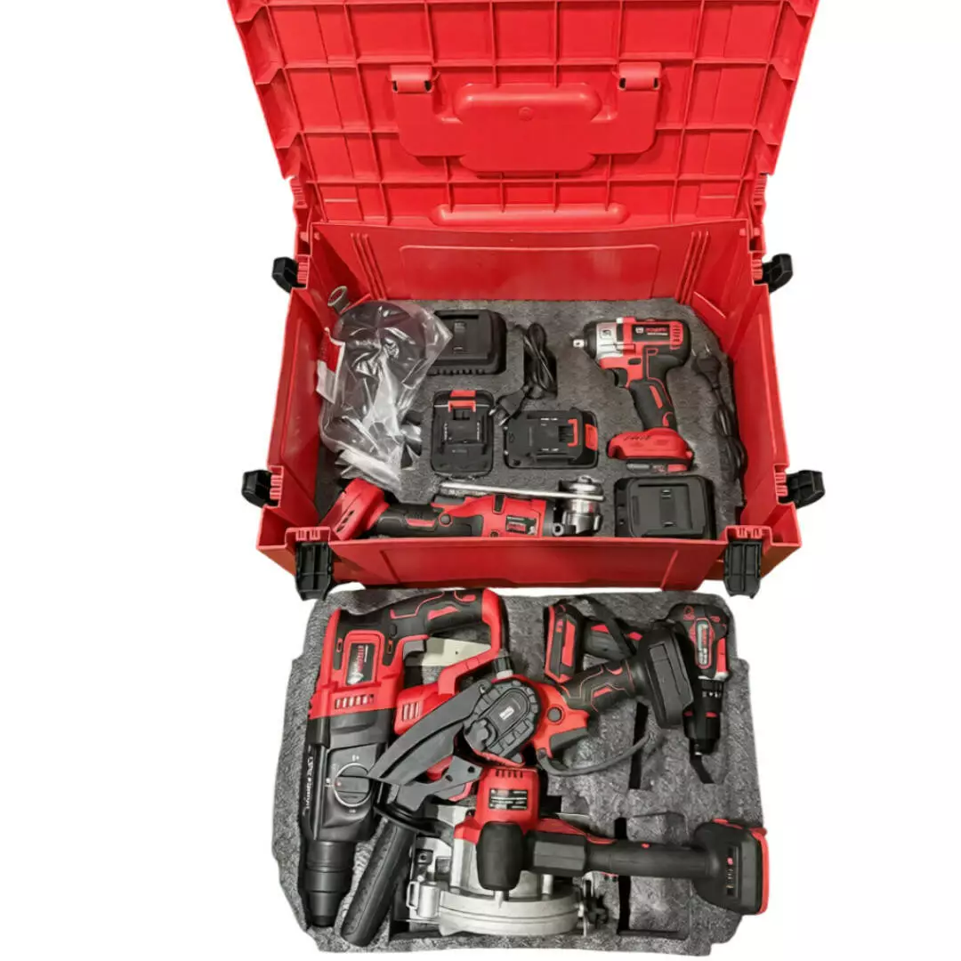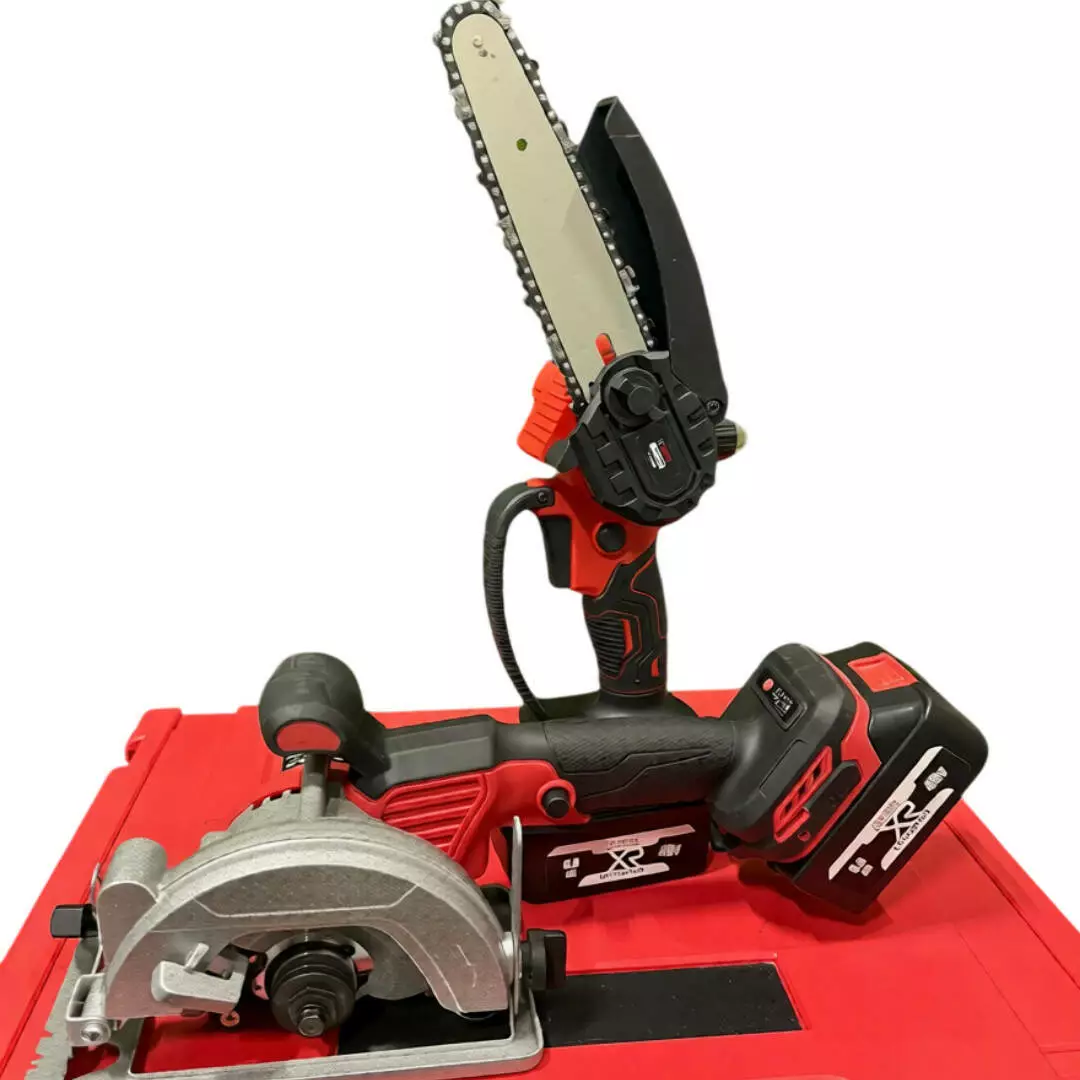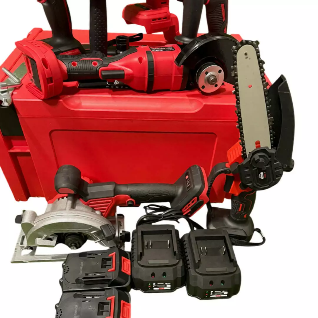 комплекту входять шурупокрут, гілкоріз, болгарка, перфоратор,