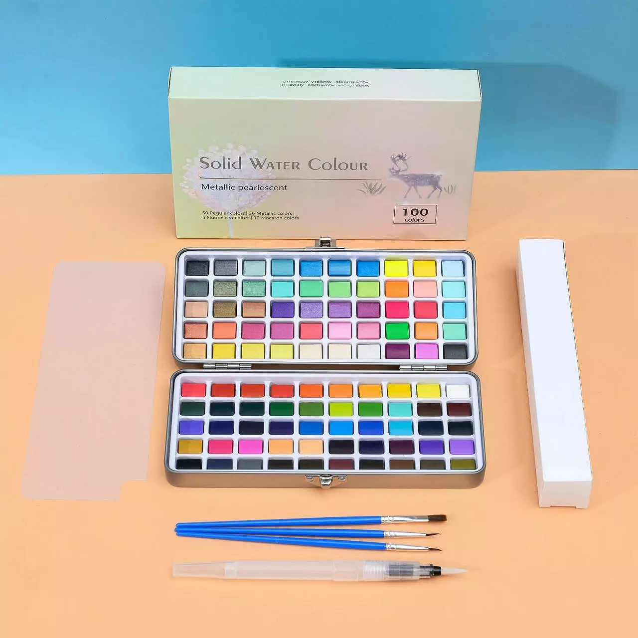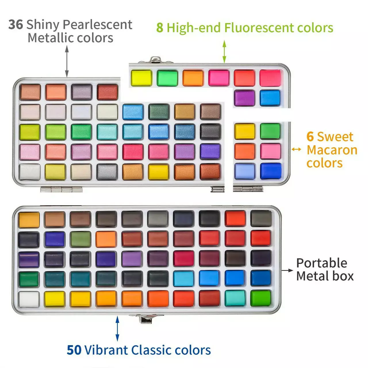 Набір акварельних фарб, який включає неонові і металічні кольори,