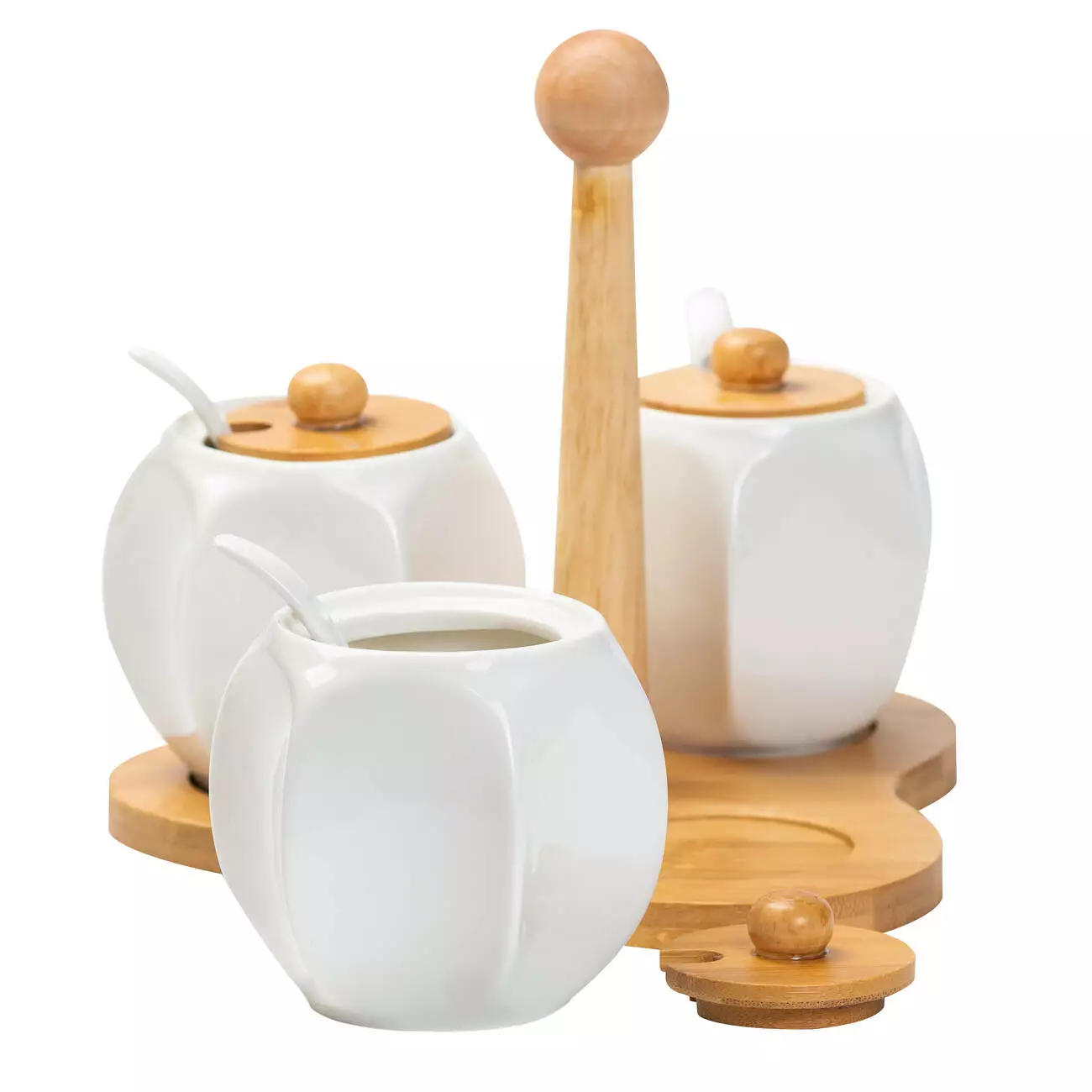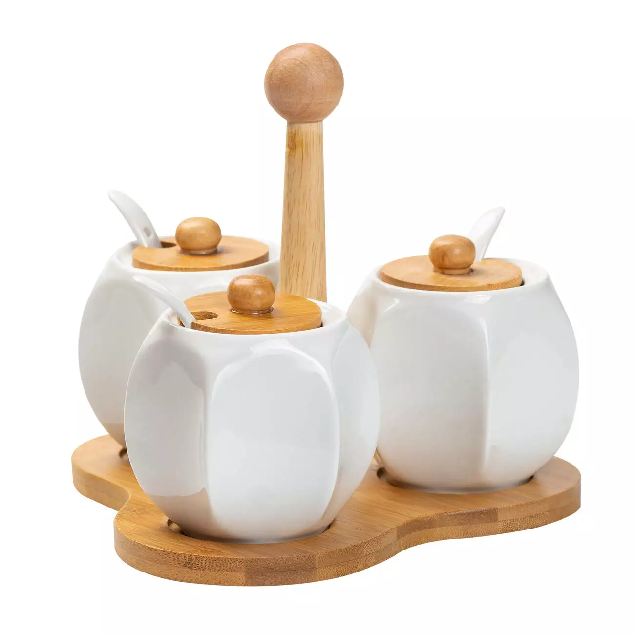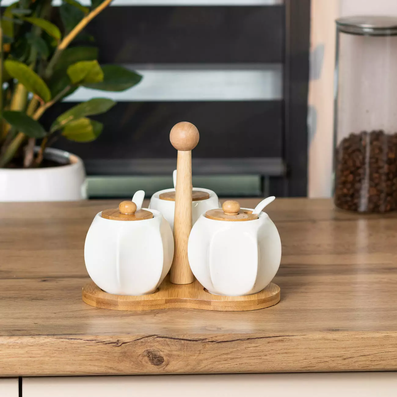 Стильний набір стане чудовим доповненням до вашої кухні. Він складається з трьох порцелянових баночок, кожна з них має дерев'яну кришку та порцелянову ложечку, а також бамбукову підставку, яка зручно вміщує всі три баночки.