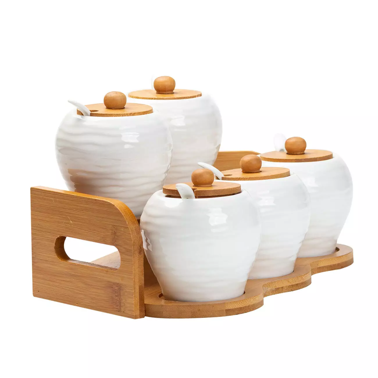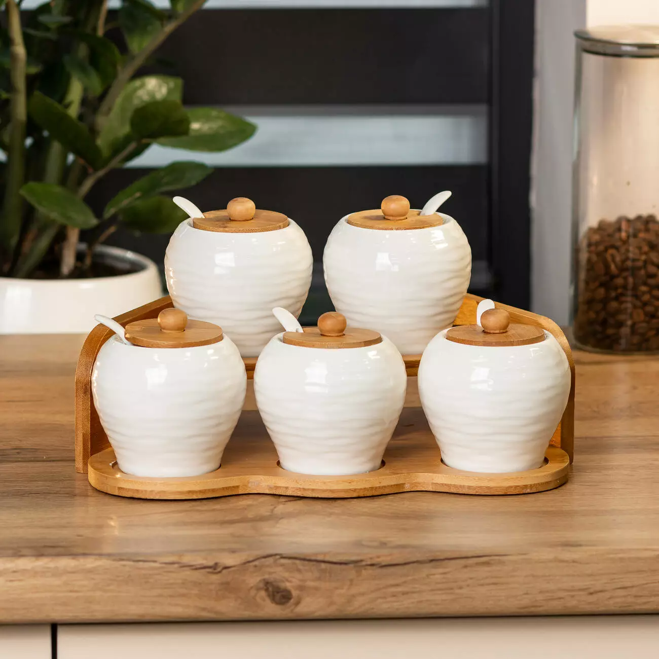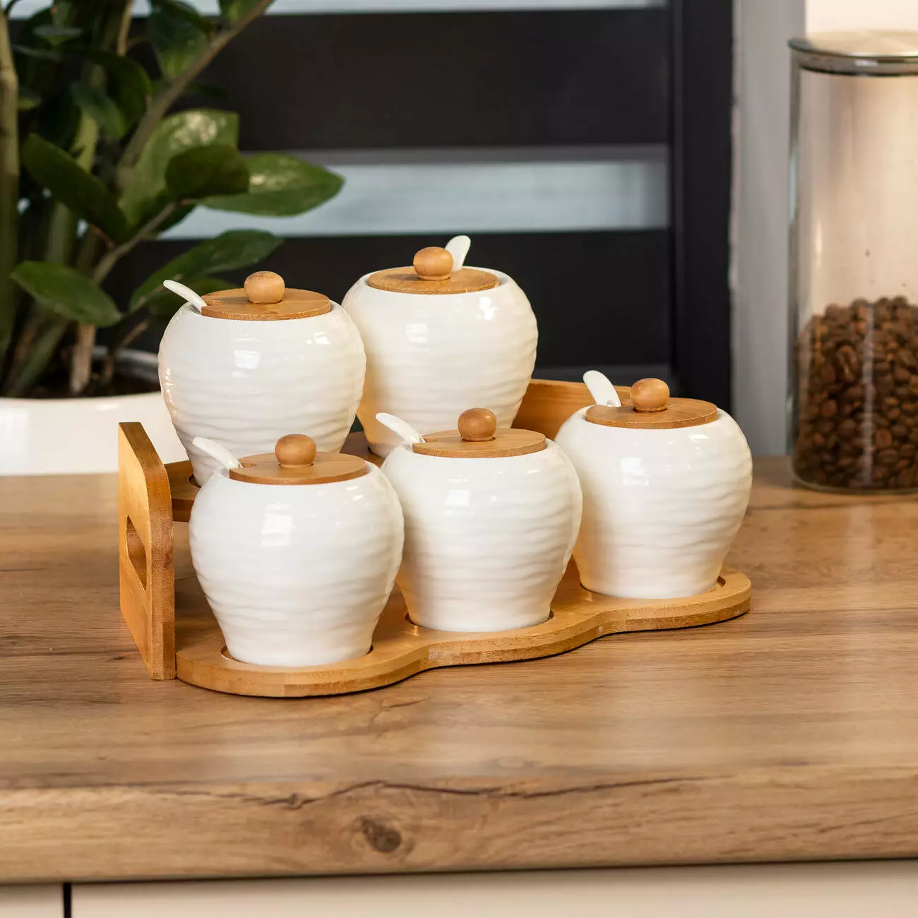 Всі баночки розташовані на зручній бамбуковій підставці, яка не тільки організовує простір, але й додає природного шарму до вашої кухні. Бамбук — це екологічно чистий матеріал, який відзначається міцністю та довговічністю, а також легко очищується і виглядає стильно.