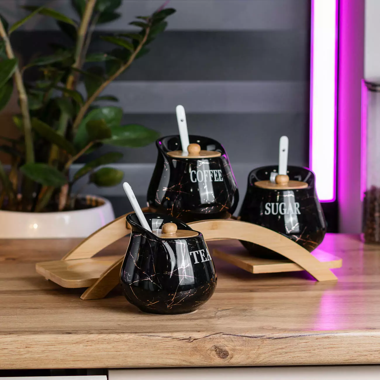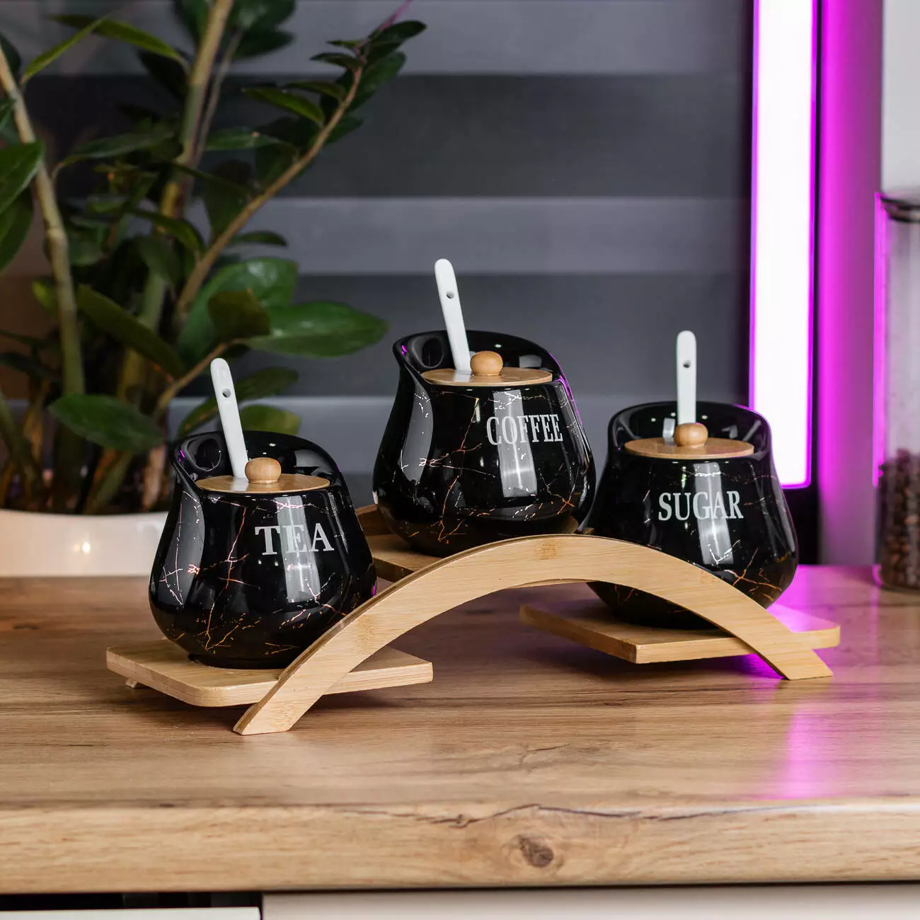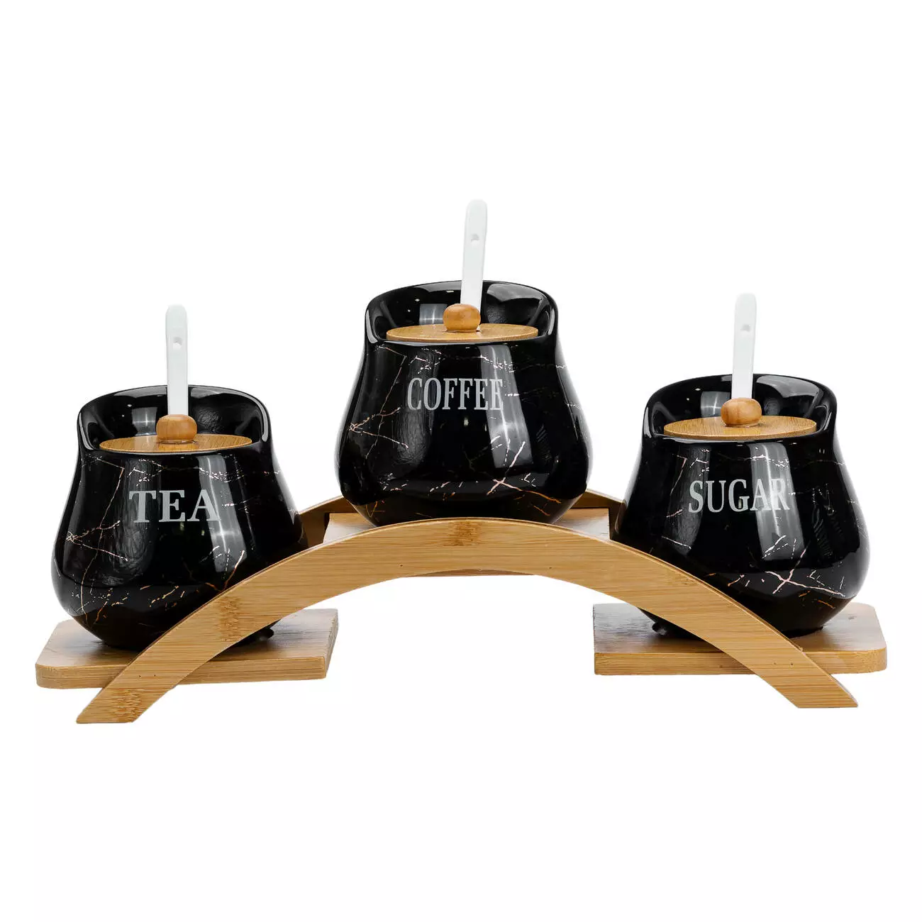 На кожній баночці нанесено напис: SUGAR, COFFEE та TEA, що допомагає швидко знайти потрібний продукт. Комплектується бамбуковою підставкою, яка додає зручності у зберіганні та організації на кухонному столі. До кожної банки додається ложечка, що робить набір ще більш практичним і функціональним.