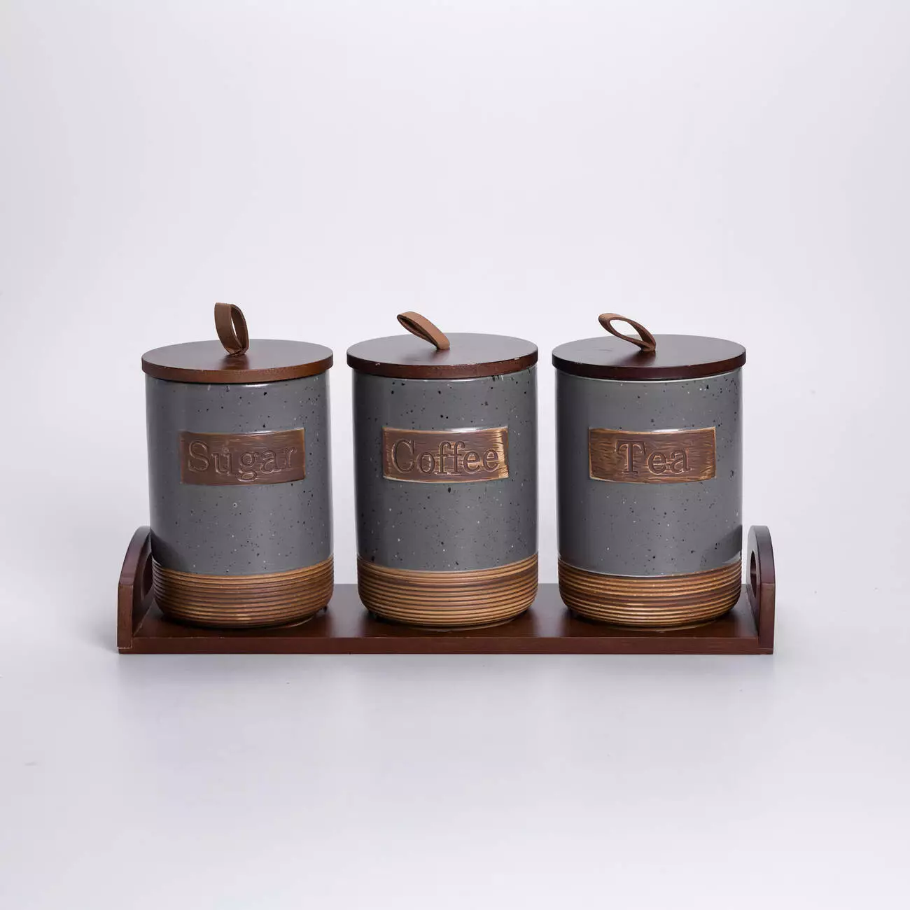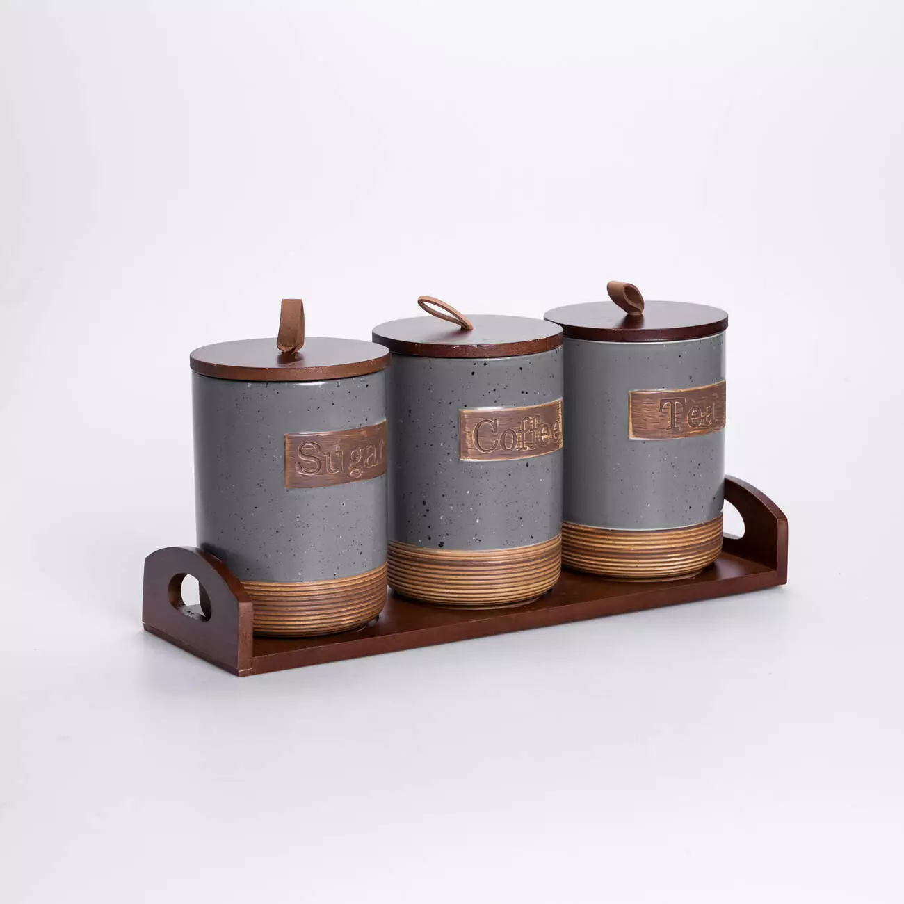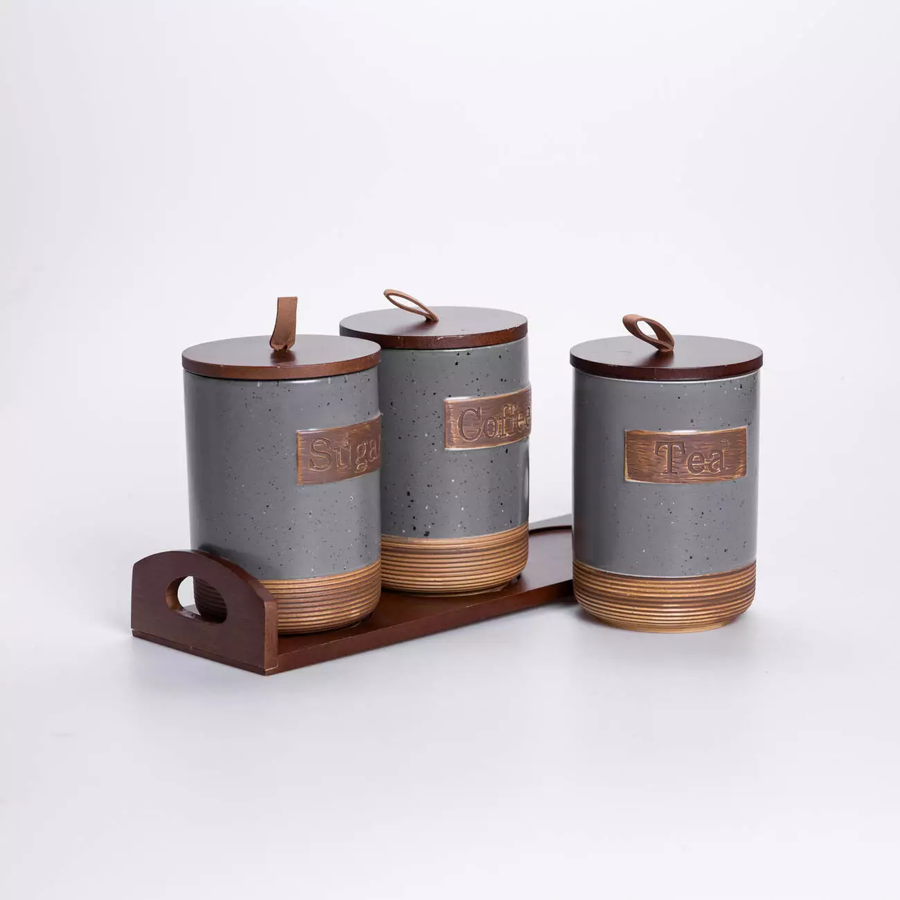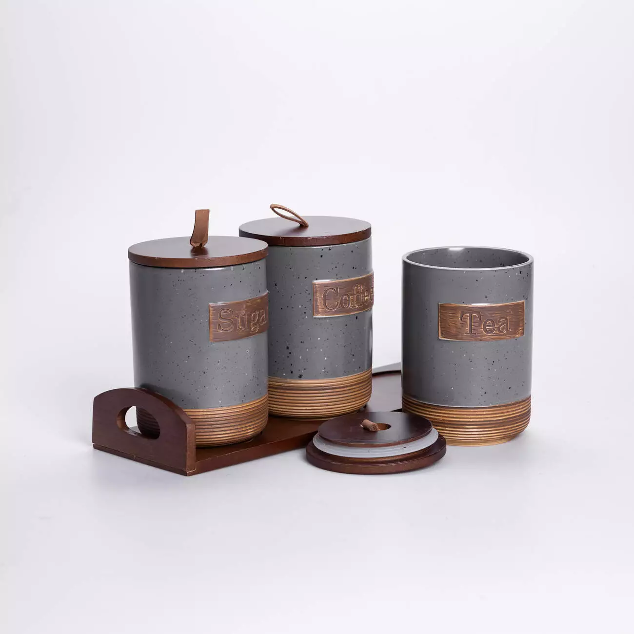 Комплект складається з 3 банок, розташованих на бамбуковій підставці, яка забезпечує стабільність і порядок на кухонній поверхні. Кришки також виконані з бамбуку, вони щільно закриваються та допомагають зберегти свіжість продуктів. Візуально набір поєднує природні матеріали та мінімалістичний дизайн, що робить його доречним у більшості сучасних інтер’єрів кухні.