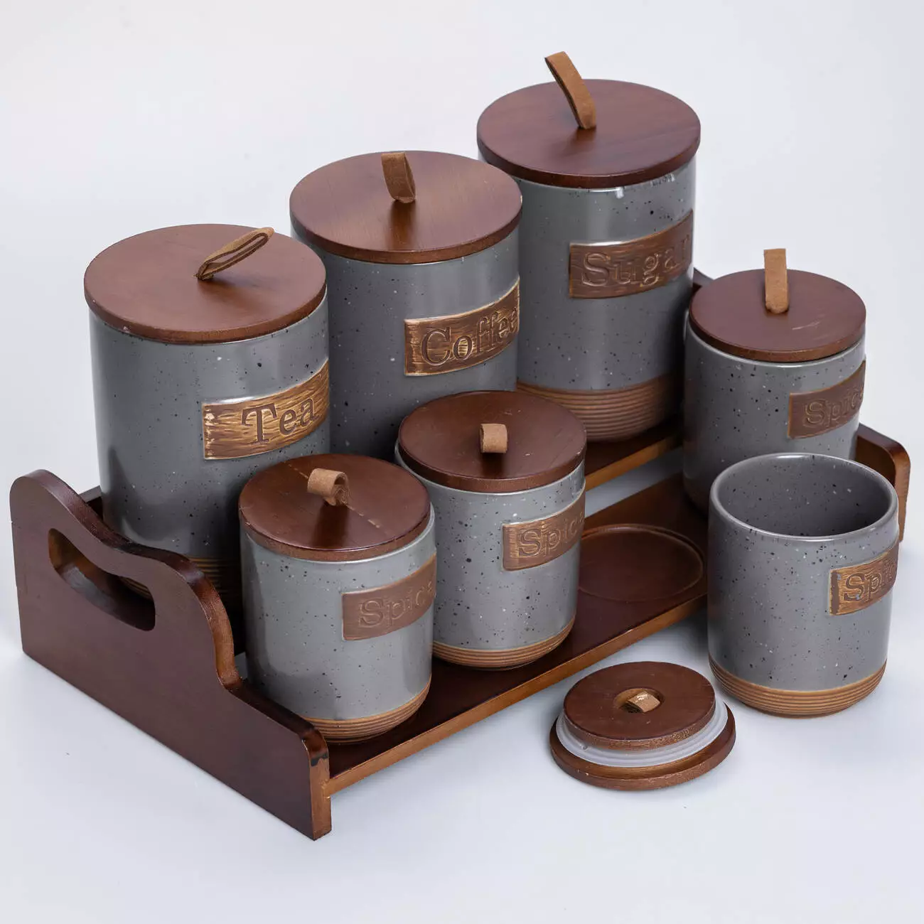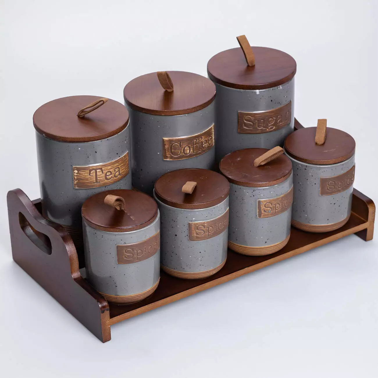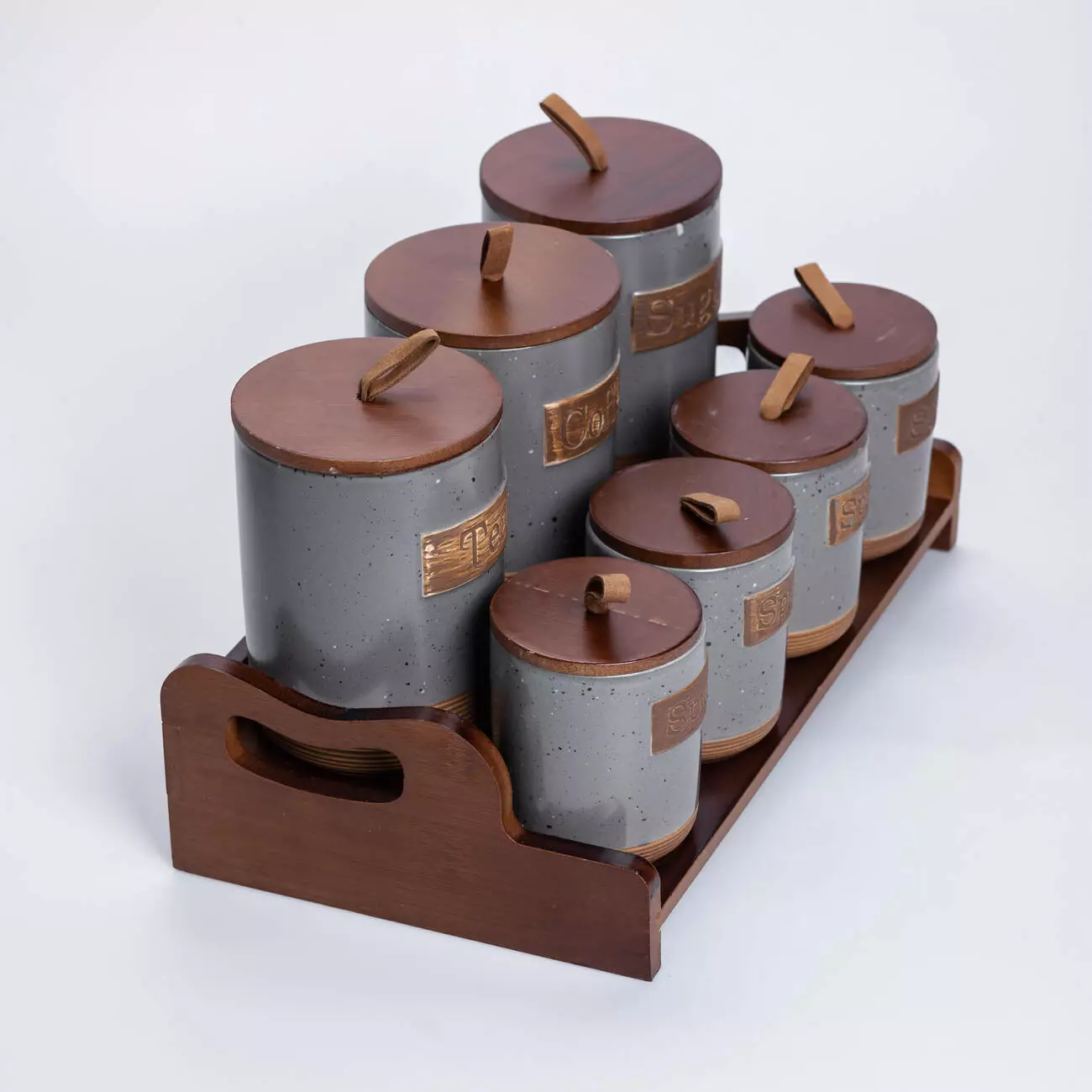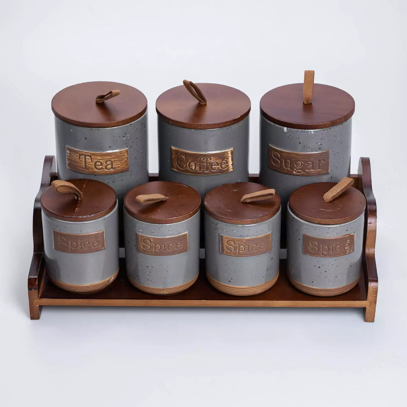 Комплект складається з 7 банок, розташованих на бамбуковій підставці, яка забезпечує стабільність і порядок на кухонній поверхні. Кришки також виконані з бамбуку, вони щільно закриваються та допомагають зберегти свіжість продуктів. Візуально набір поєднує природні матеріали та мінімалістичний дизайн, що робить його доречним у більшості сучасних інтер’єрів кухні.