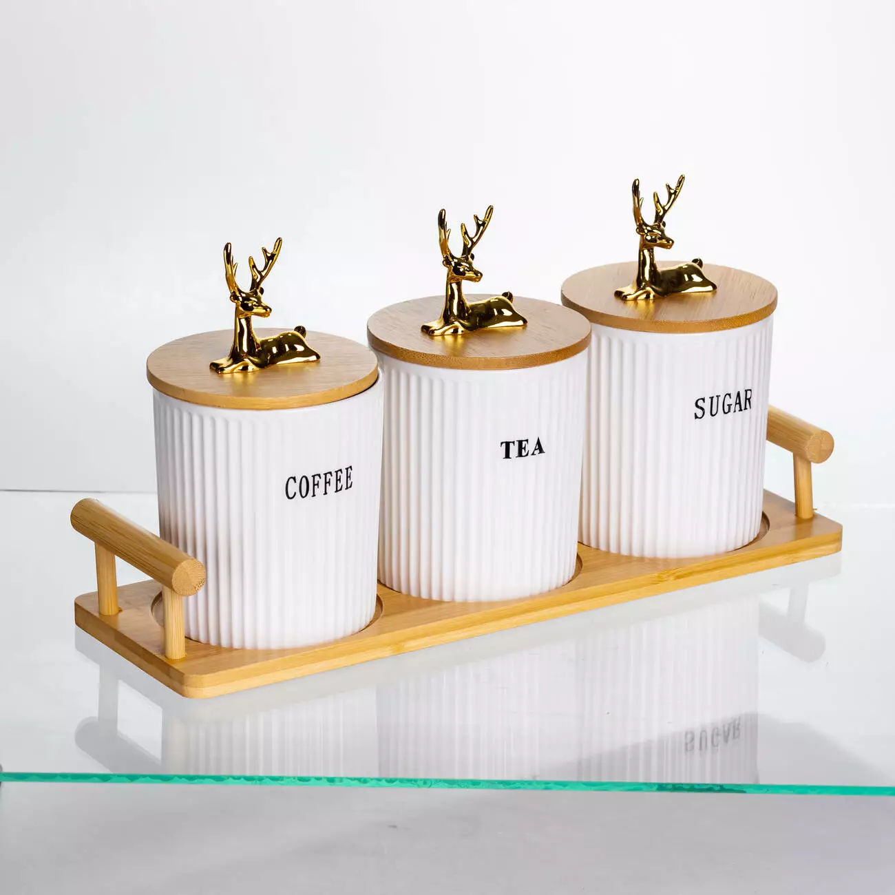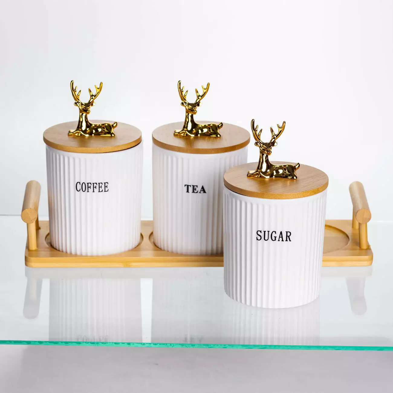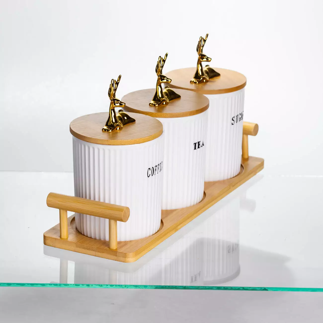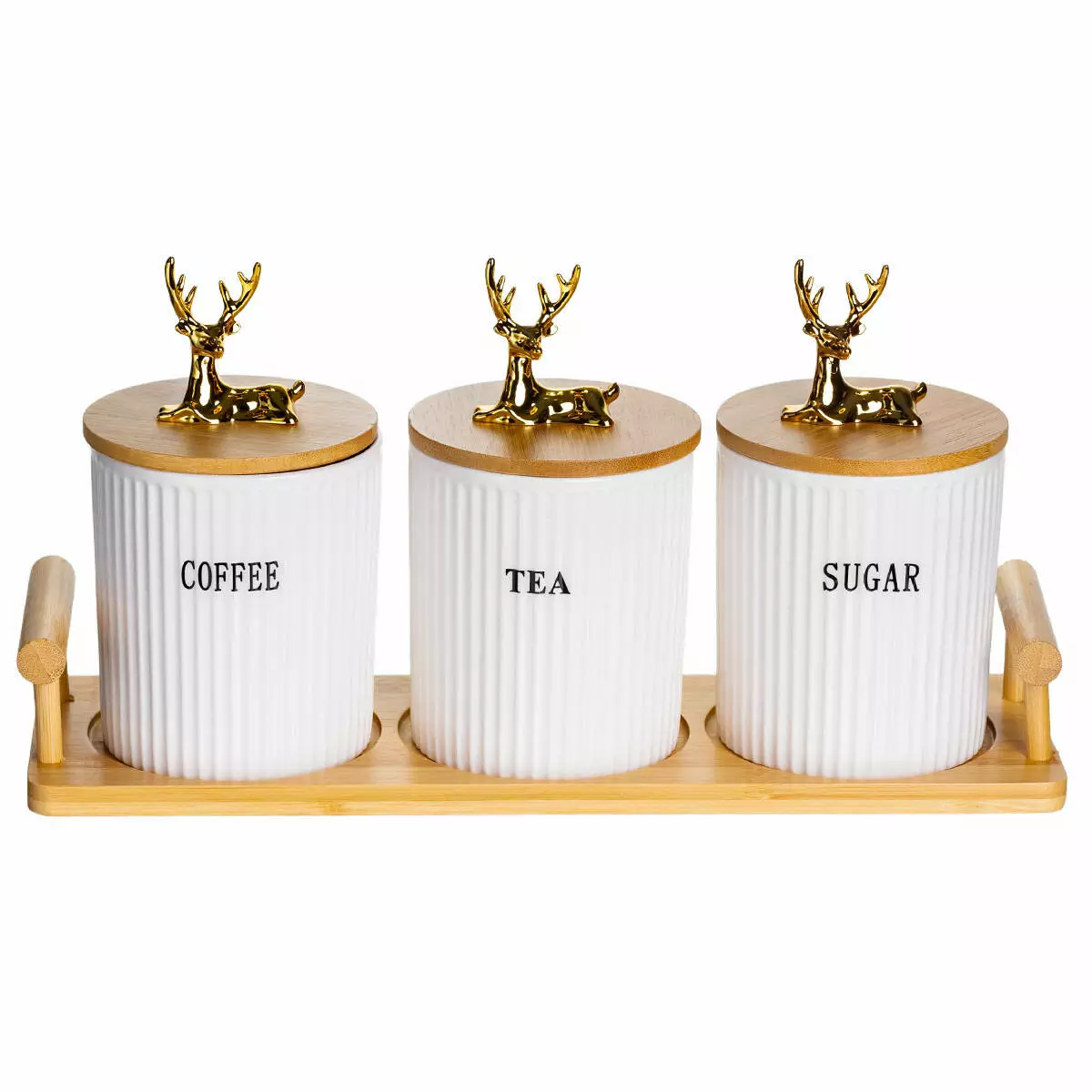 Кришки виготовлені з бамбука та доповнені декоративними фігурками у вигляді золотих оленів. Вони щільно прилягають до банок, захищаючи вміст від вологи та сторонніх запахів. Об’єм кожної ємності — 400 мл, що оптимально підходить для щоденного використання. Завдяки висоті 10 см і діаметру 9 см банки легко розміщуються на полицях або в шафі, не займаючи зайвого простору.
