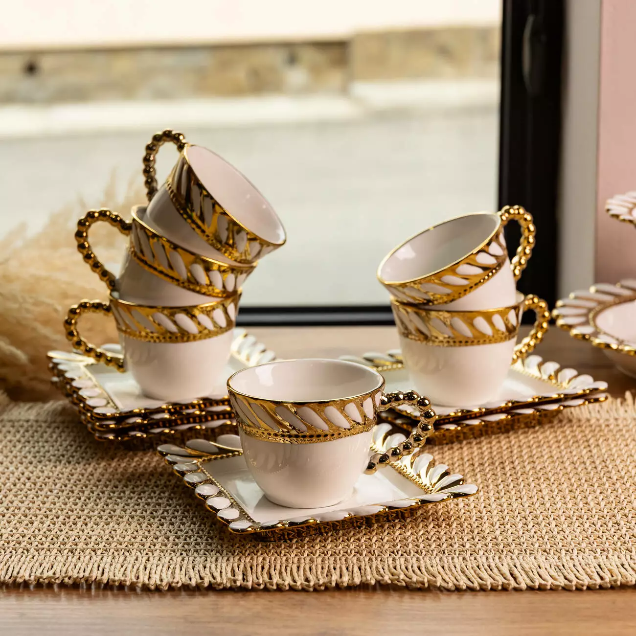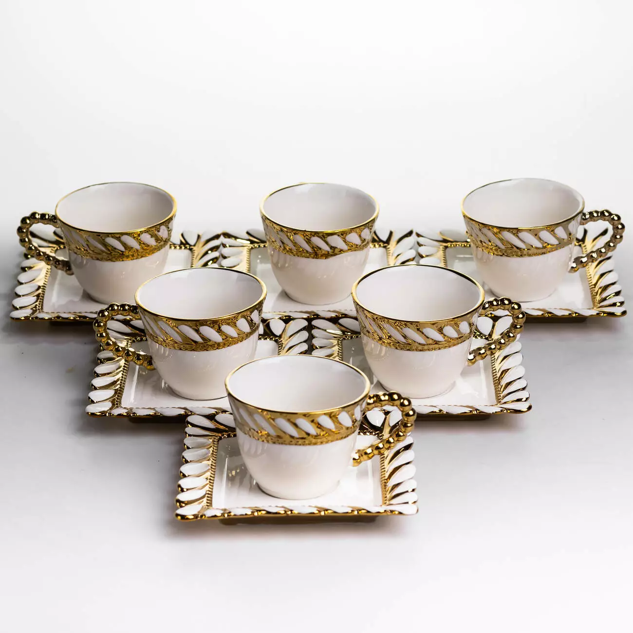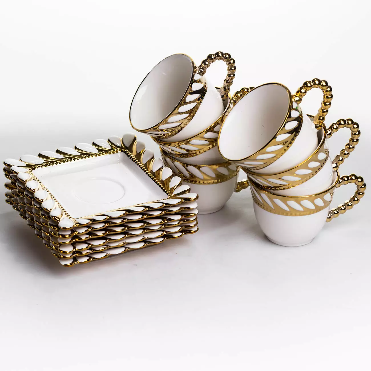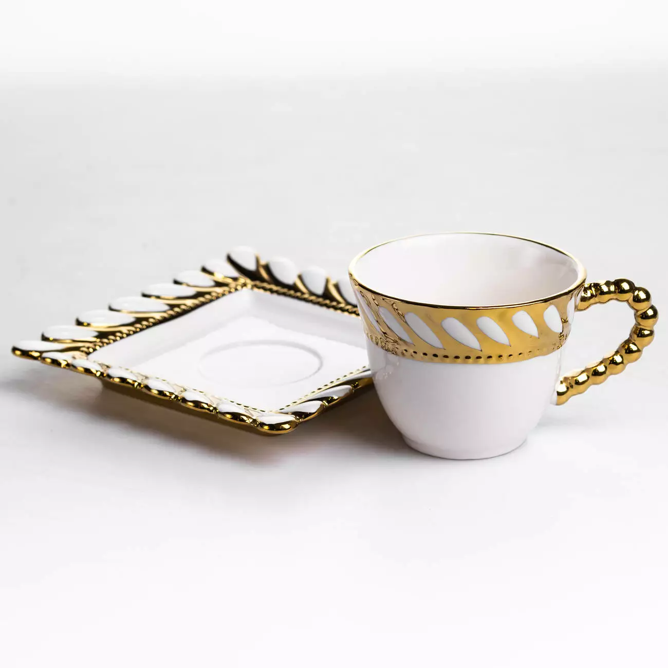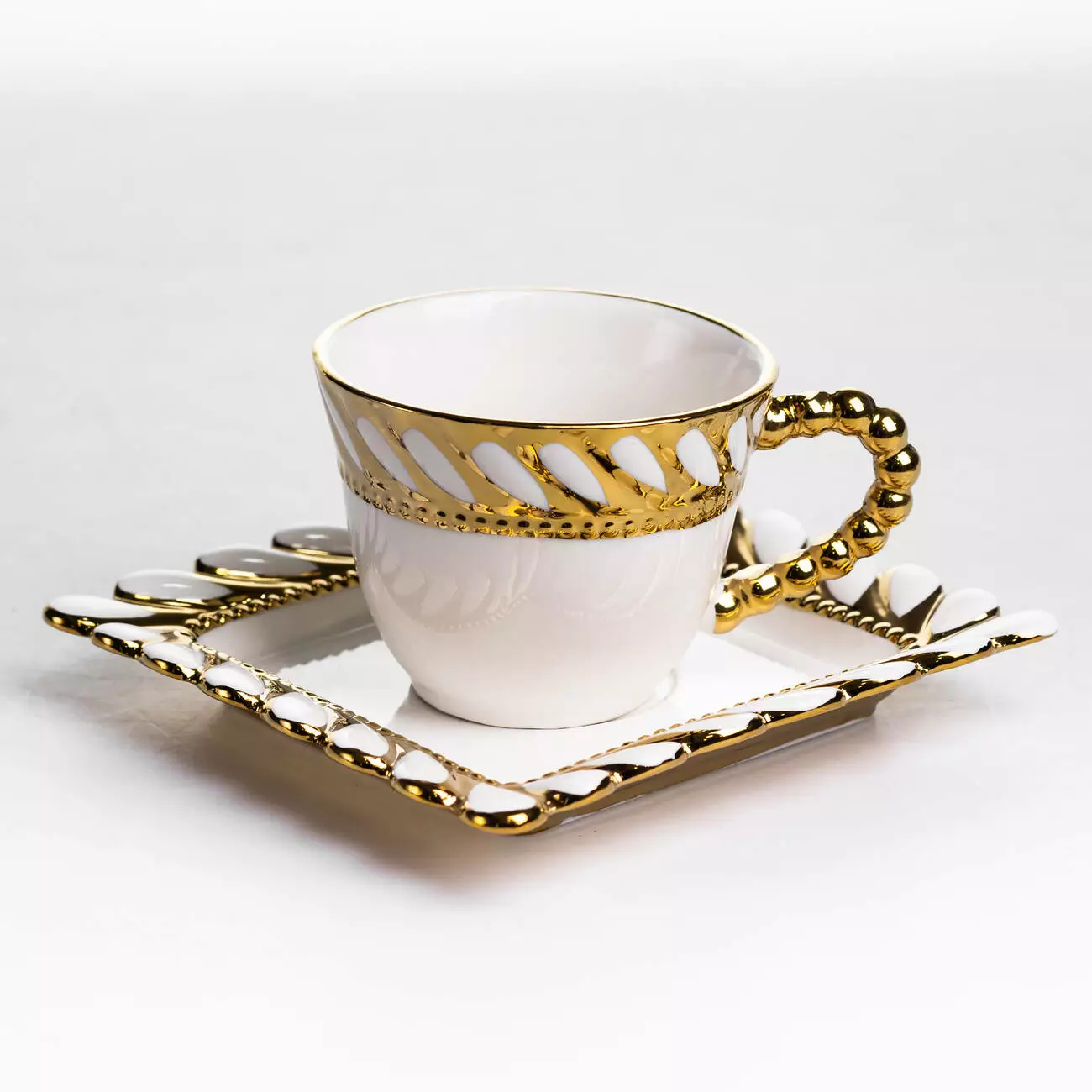 Край чашок і блюдець оформлений рельєфним узором у вигляді переплетеного каната по периметру. Декор доповнений тонкою золотою окантовкою, яка підкреслює форму кожного елемента. Поєднання квадратних блюдець із округлими чашками створює виразний, але збалансований вигляд у сервіруванні.