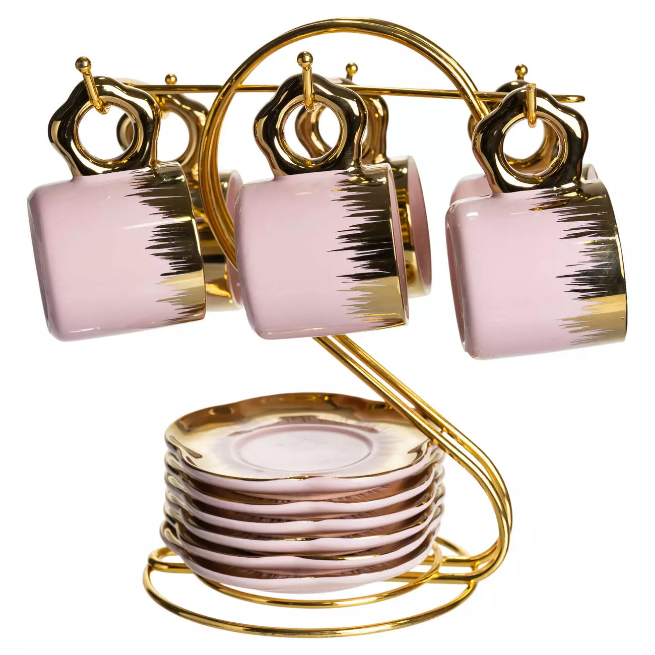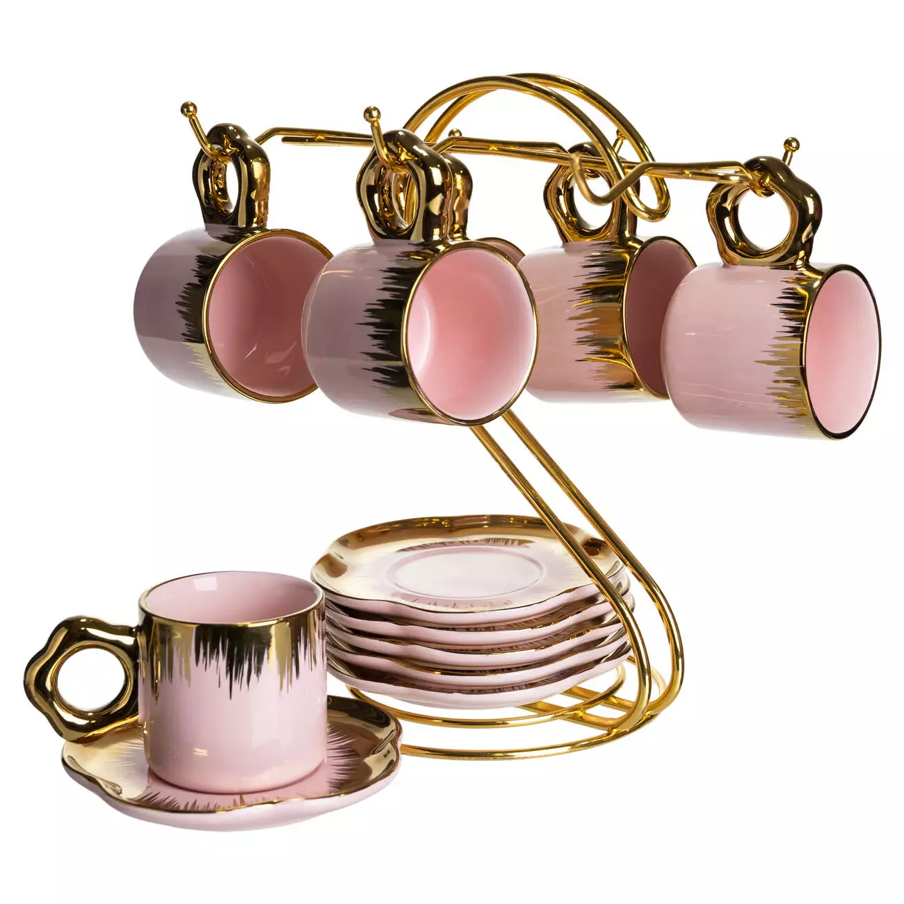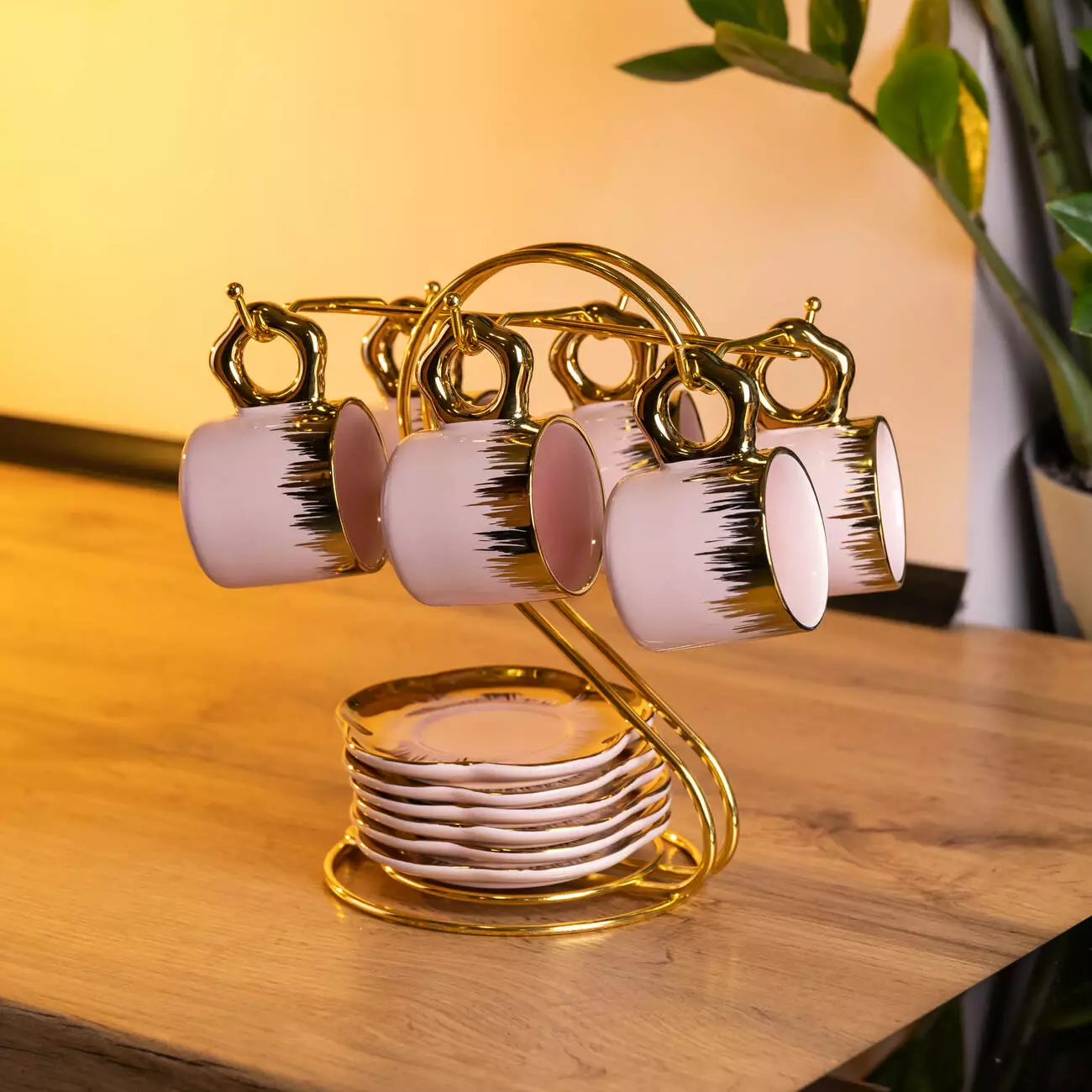 Міцна металева підставка додає сервіруванню завершеного вигляду й водночас забезпечує надійне розташування всіх елементів. Сервіз пасує як для щоденного використання, так і для подачі кави під час зустрічей чи святкових моментів.