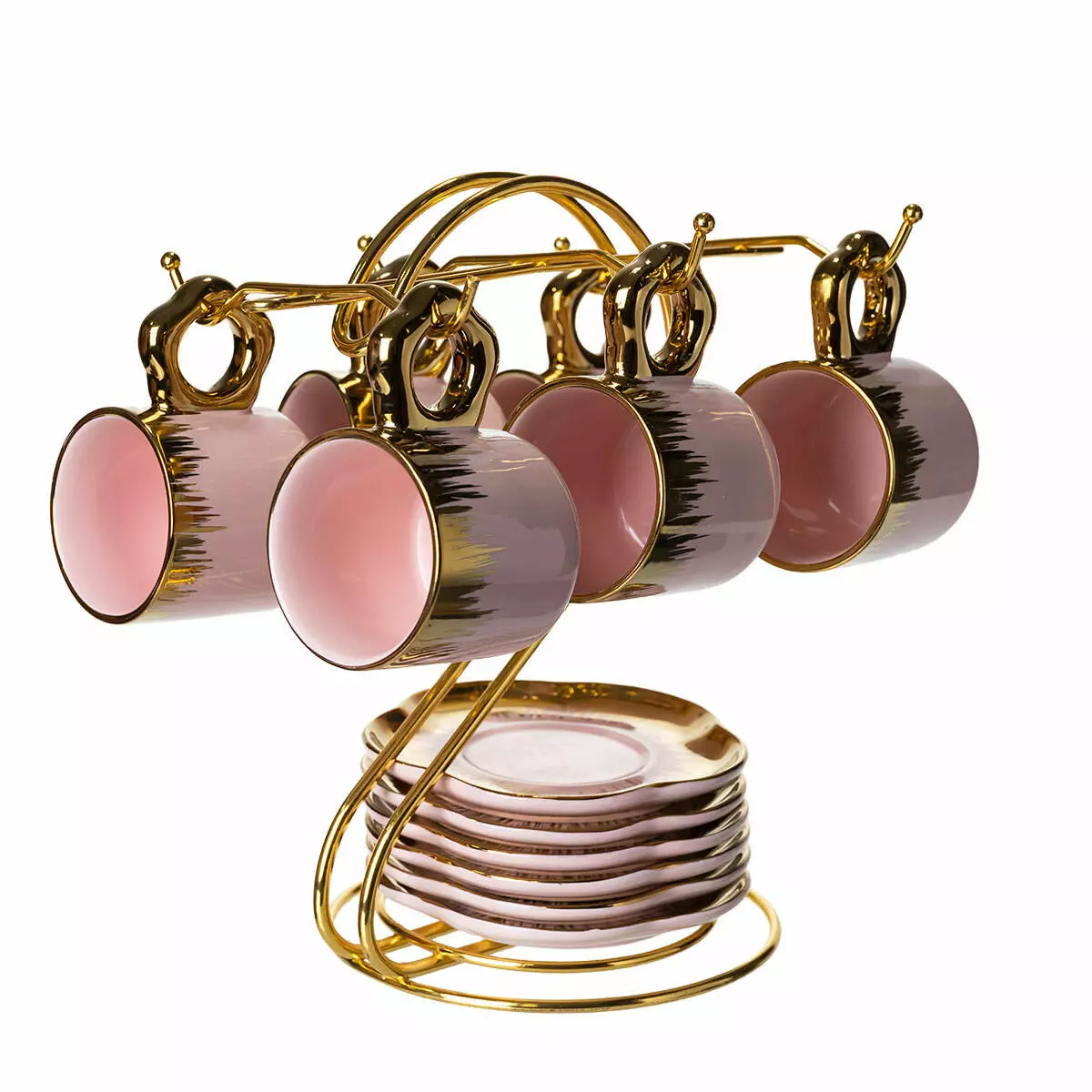 Порцеляновий набір на металевій підставці — поєднання витонченості та практичності. Комплект складається з шести чашок і шести блюдець, розміщених на елегантній підставці, що додає акуратності та зручності зберігання. Завдяки компактному дизайну сервіз чудово виглядає на кухонній полиці чи обідньому столі.