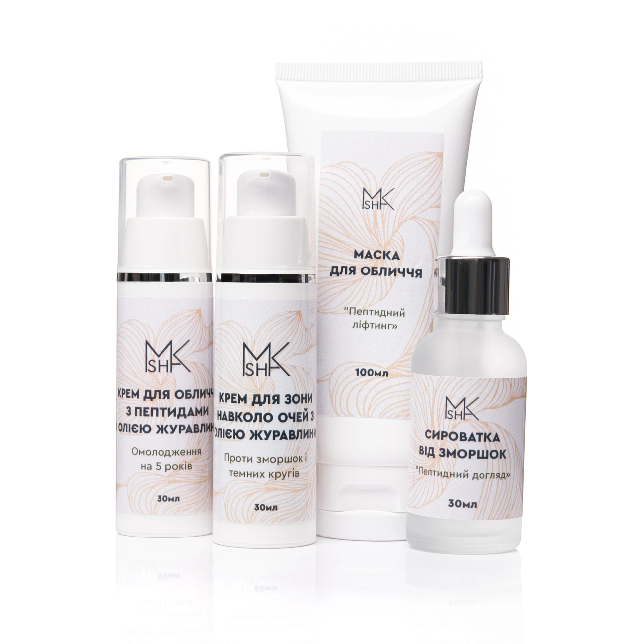 Склад набору : Маска "Пептидний ліфтинг" , сироватка проти зморшок "Пептидний догляд", крем для обличчя з пептидами і олією журавлини . крем для зони навколо очей з олією журавлини.