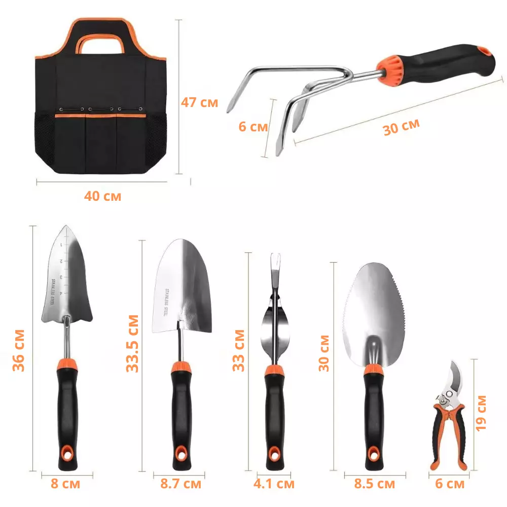 Включає секатор, лопатку для пересадки, ручні граблі, культиватор,