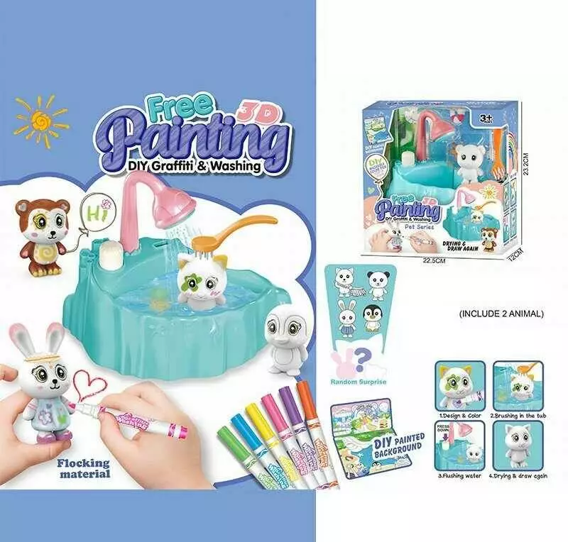 Набір для творчості 822 (48/2) 2 флоксові фігурки тварин, помпова подача води, 6 кольорових фломастерів, ванночка, щіточка, в коробці