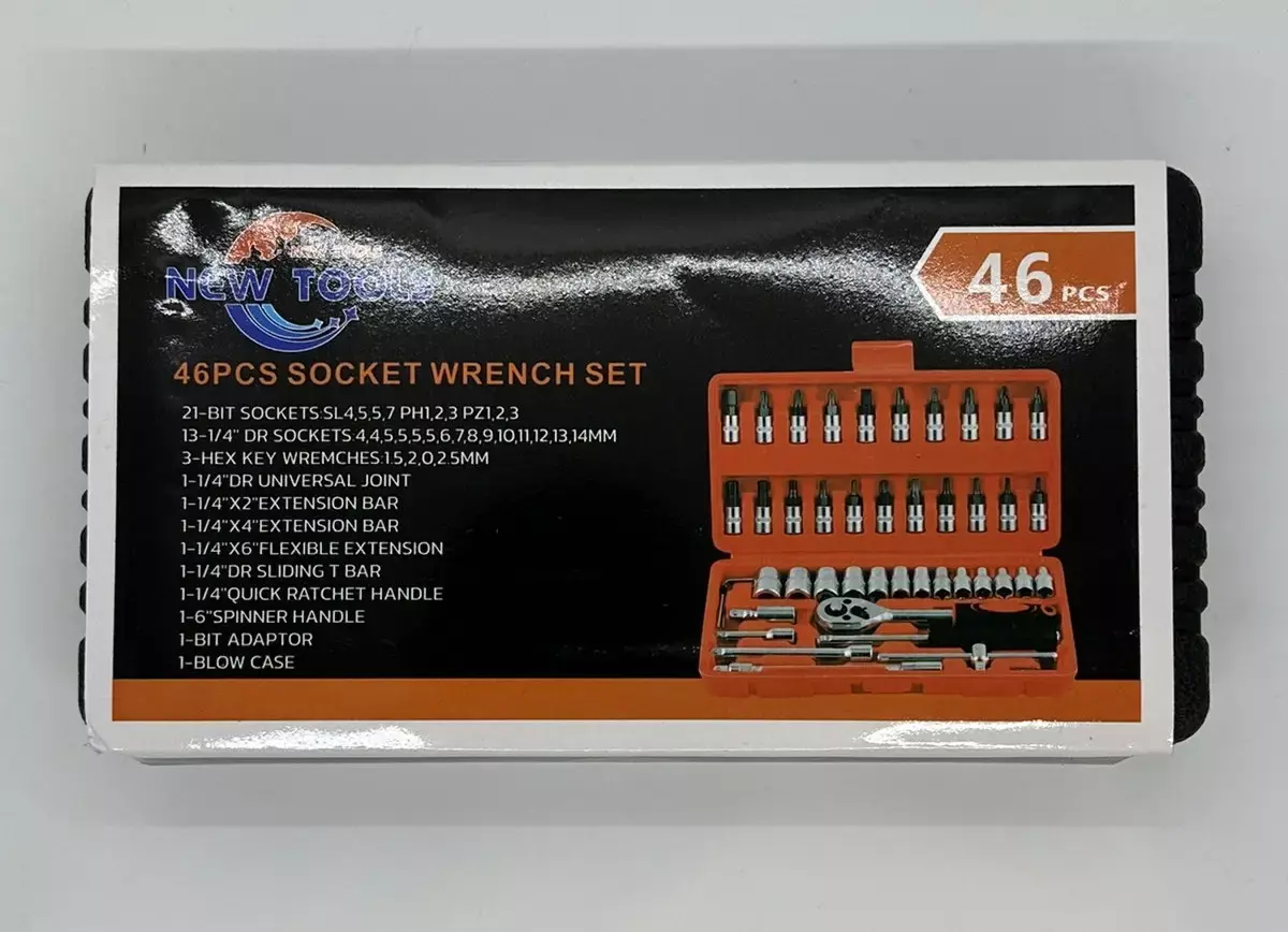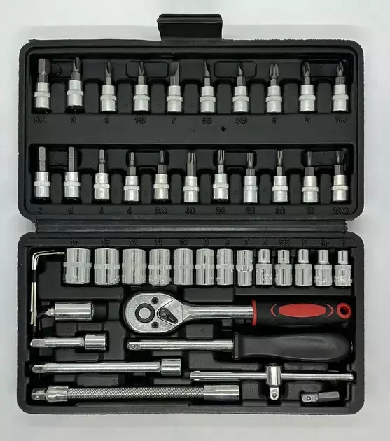 Набір торцевих головок і насадок включає 46 предметів, у тому числі