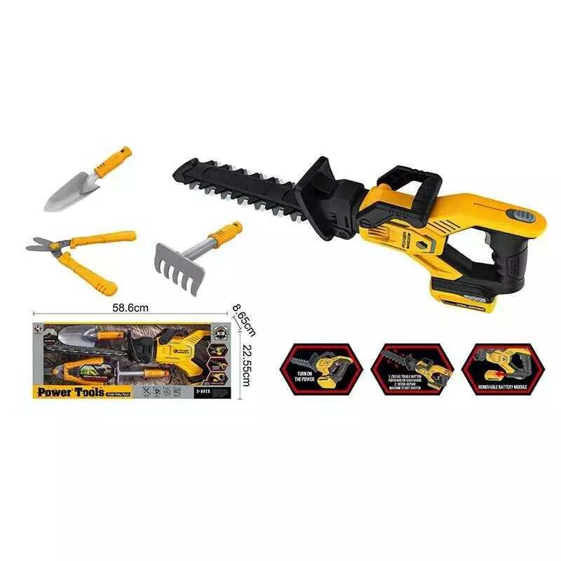 Головна > Каталог > Іграшки > Ігрові набори > Набір інструментів T 021 (12) кущоріз на батарейках, звукові ефекти, зубці рухаються, рухома ручка-тримач, садові ножиці, лопатка, граблі, в коробці оптом