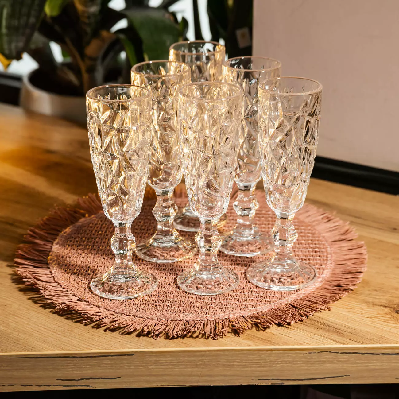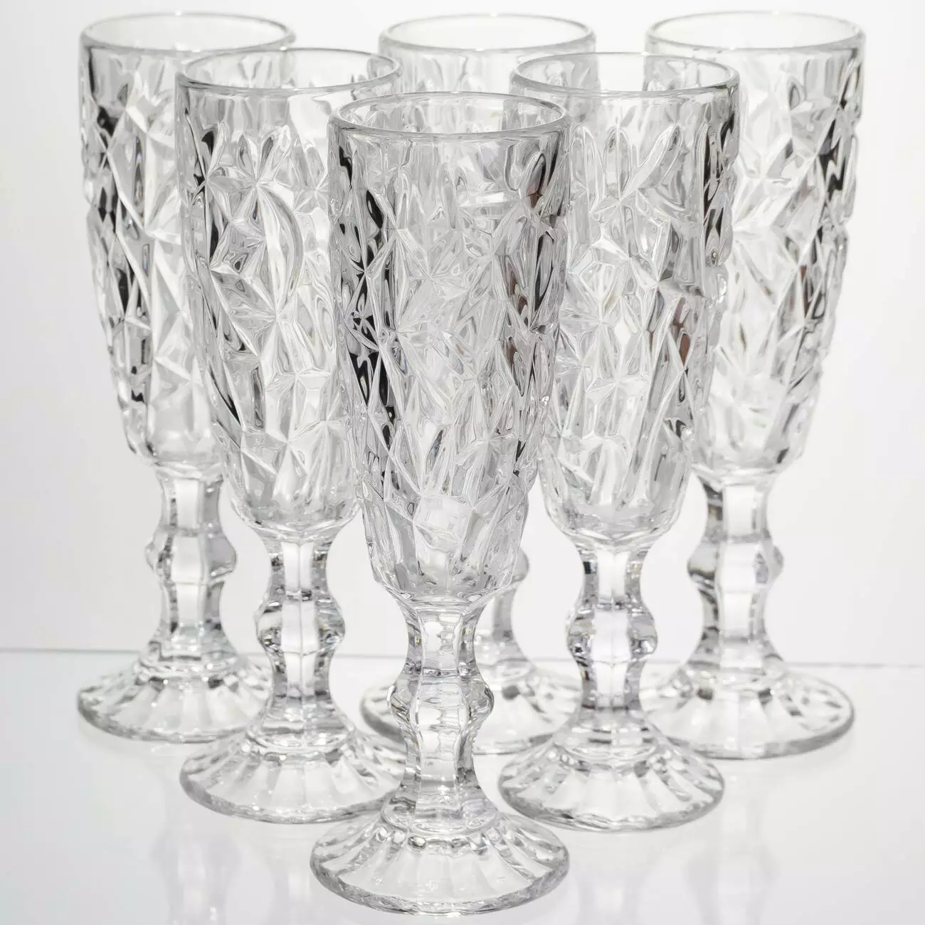 Шість витончених келихів об'ємом 160 мл - ідеальне рішення для святкового сервірування. Висока ніжка та форма келиха зберігають аромат шампанського, а текстура «колотий лід» перетворює кожну подачу на маленьке шоу світла. Надійний варіант для ресторанів та домашнього використання – поєднання практичності та візуальної привабливості.