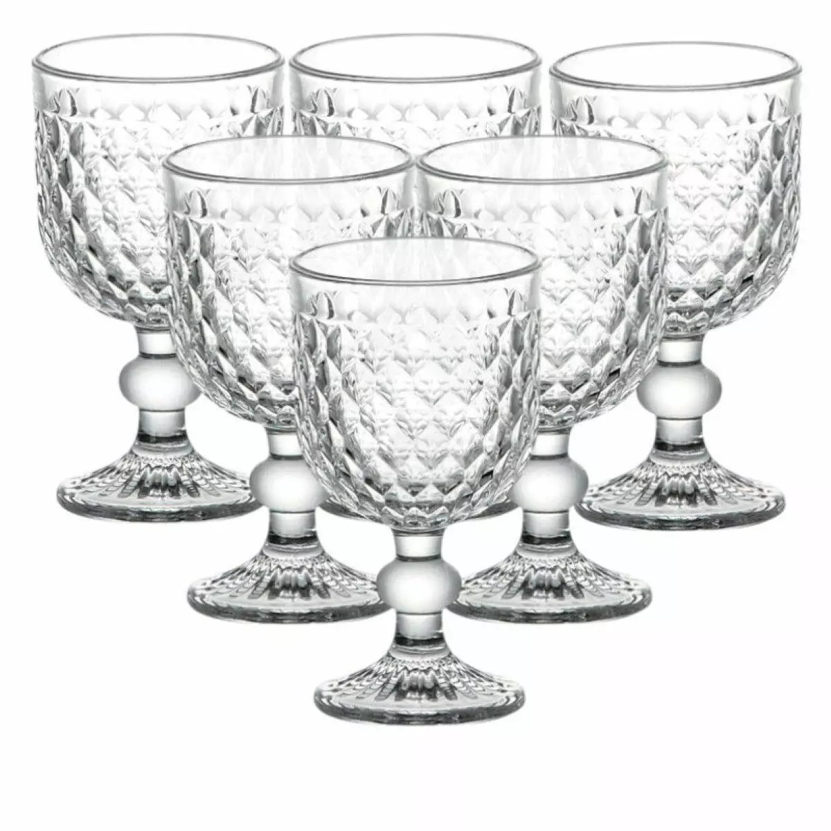 Набір келихів для вина складається з 6 штук, виготовлених із прозорого кришталевого скла. Поверхня оформлена декоративними вигинами у формі ромбів, які створюють виразну фактуру та підкреслюють прозорість матеріалу. Завдяки такому оформленню вироби ефектно виглядають при сервіруванні.