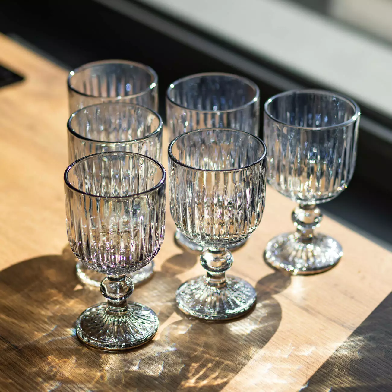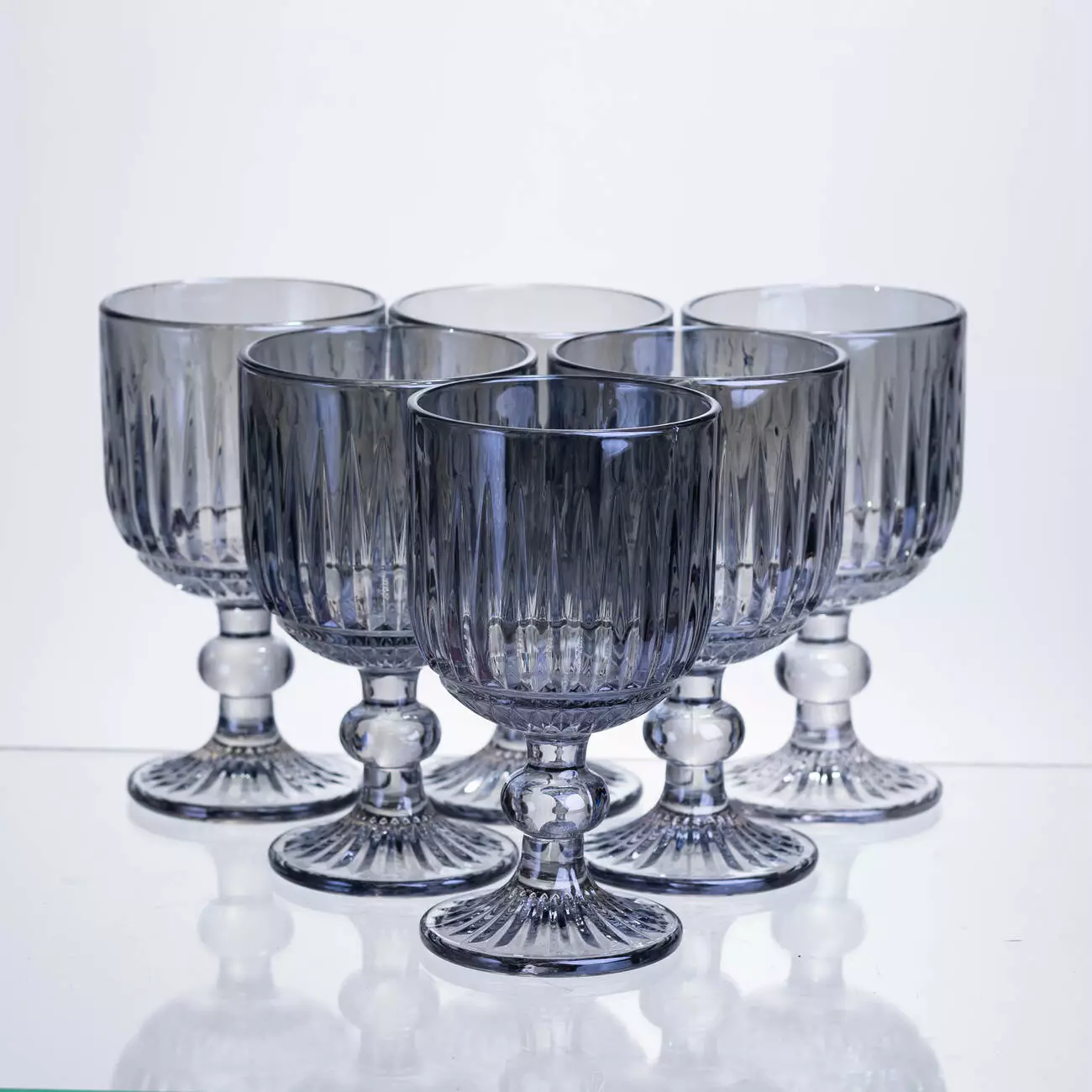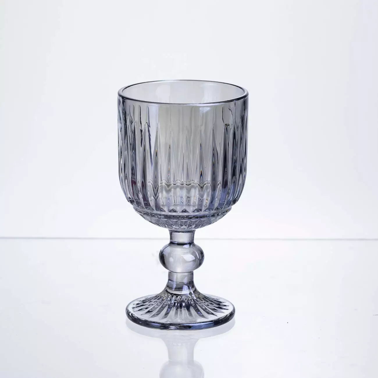 Поверхня келихів рифлена, з чіткими вертикальними лініями по всій чаші, що створює гру світла та додає виробу візуальної глибини. Чаша має форму широкого, відкритого кубка, злегка розширеного догори, що забезпечує зручну подачу вина.