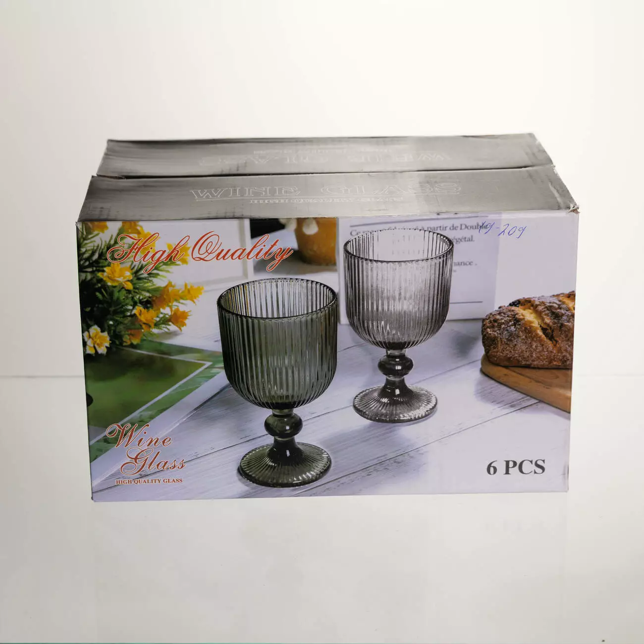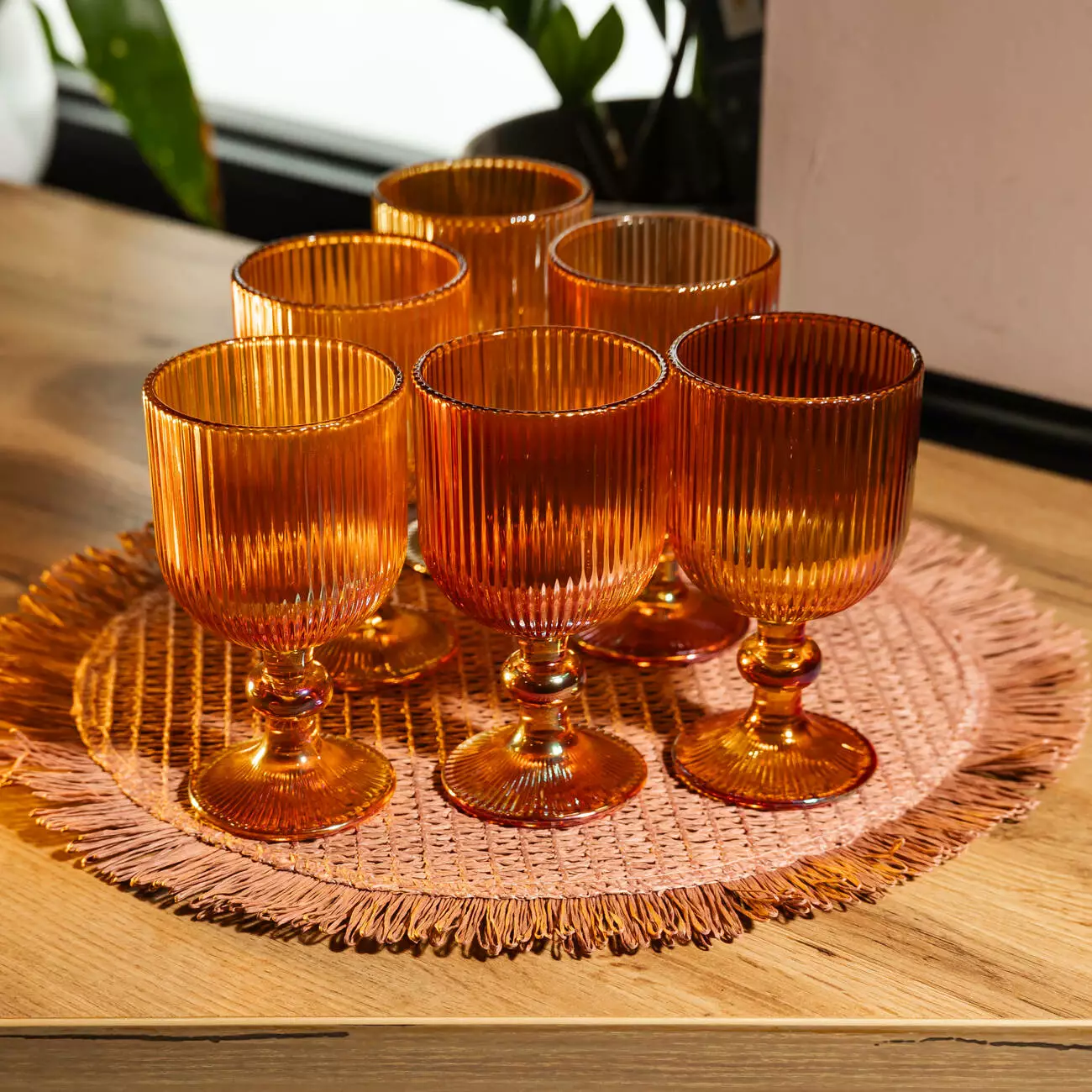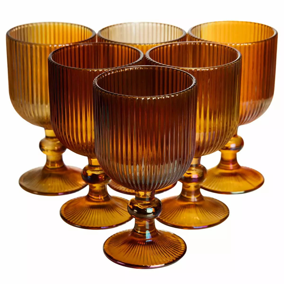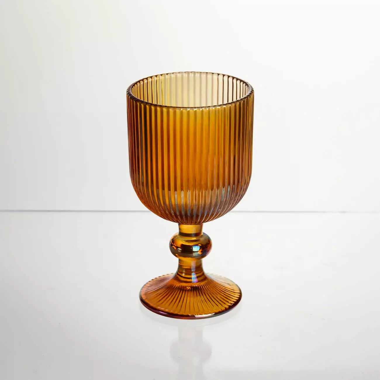 Поверхня келихів рифлена, з чіткими вертикальними лініями по всій чаші, що створює гру світла та додає виробу візуальної глибини. Чаша має форму широкого, відкритого кубка, злегка розширеного догори, що забезпечує зручну подачу вина. Келихи оснащені короткою фігурною ніжкою та широкою круглою основою, що гарантує стійкість і комфортний захват.
