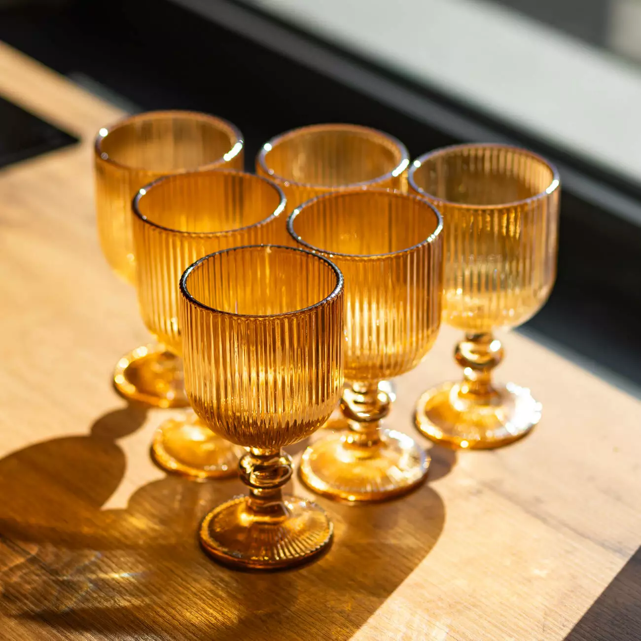 Поверхня келихів рифлена, з чіткими вертикальними лініями по всій чаші, що створює гру світла та додає виробу візуальної глибини. Чаша має форму широкого, відкритого кубка, злегка розширеного догори, що забезпечує зручну подачу вина. Келихи оснащені короткою фігурною ніжкою та широкою круглою основою, що гарантує стійкість і комфортний захват.