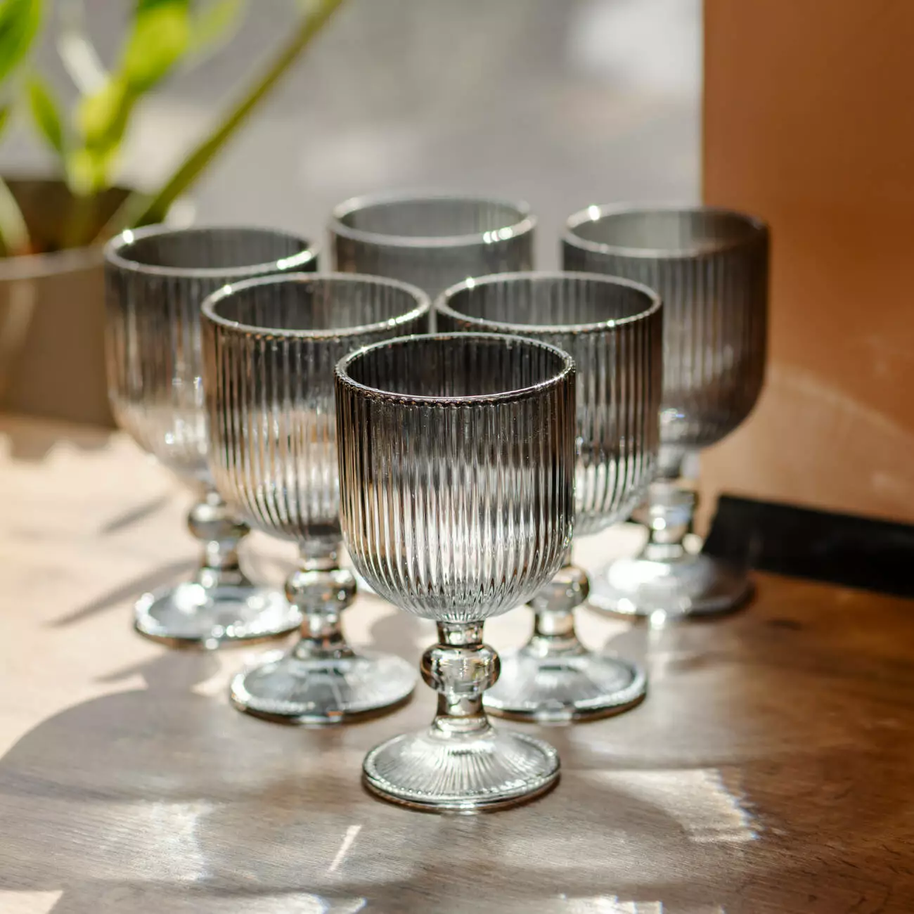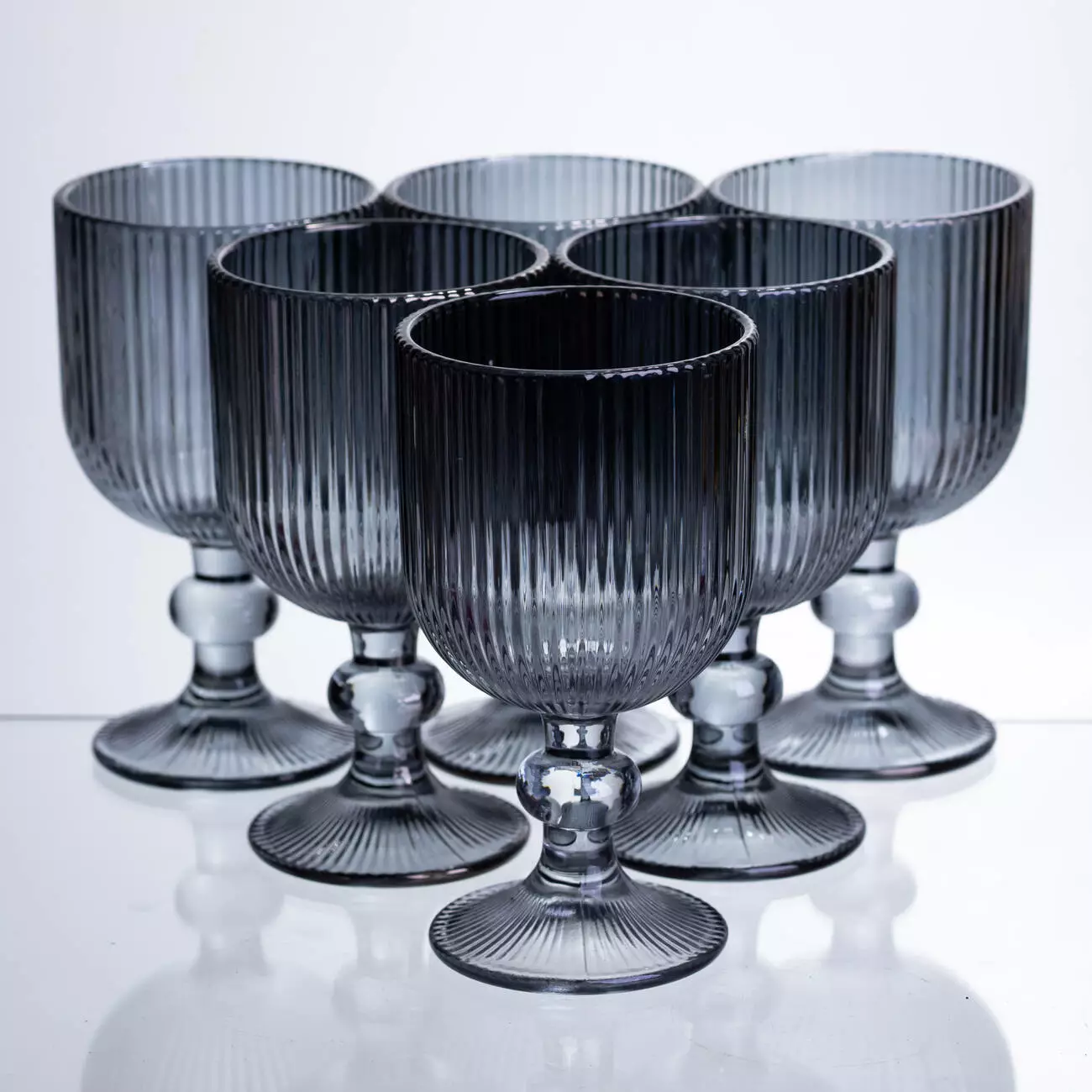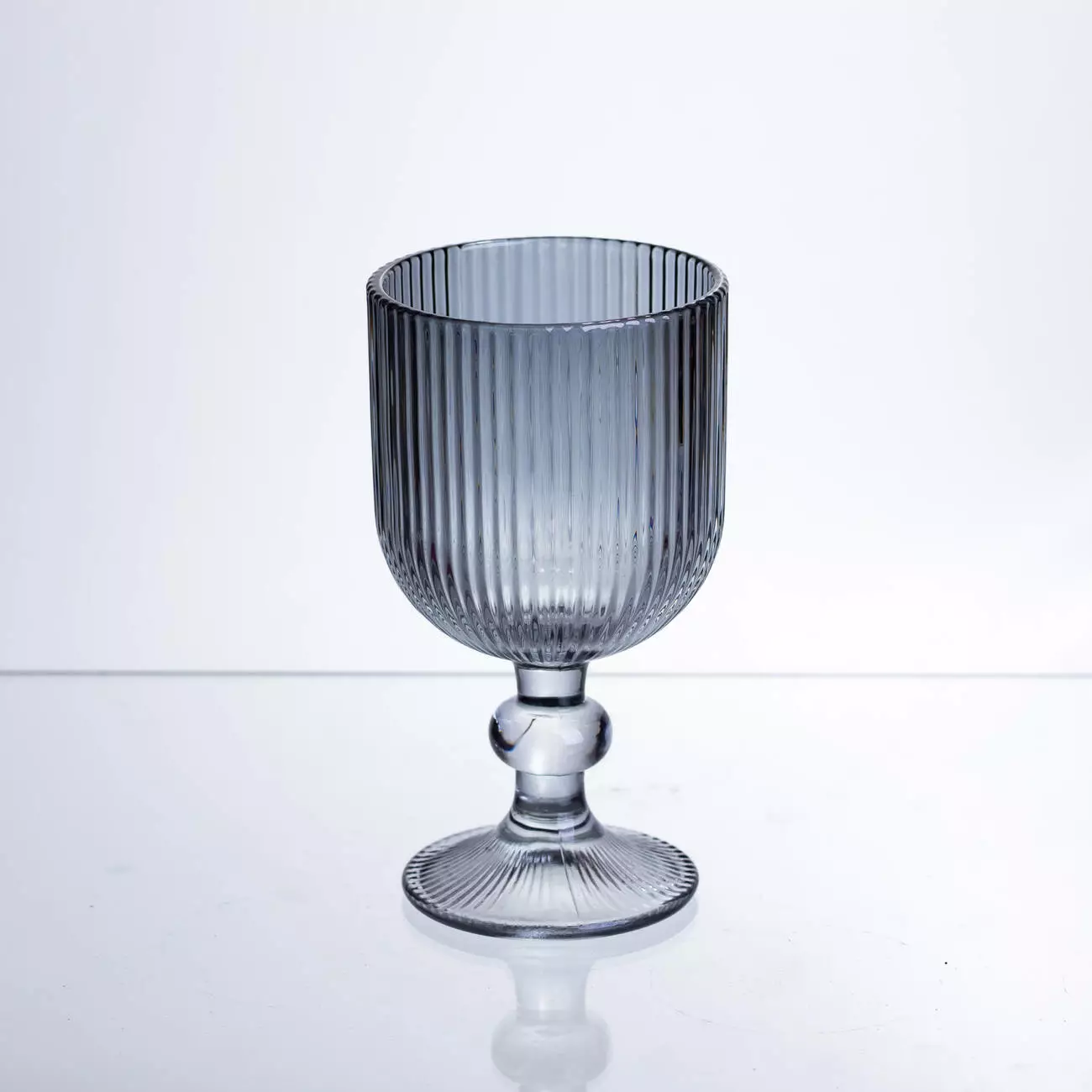 Поверхня келихів рифлена, з чіткими вертикальними лініями по всій чаші, що створює гру світла та додає виробу візуальної глибини. Чаша має форму широкого, відкритого кубка, злегка розширеного догори, що забезпечує зручну подачу вина. Келихи оснащені короткою фігурною ніжкою та широкою круглою основою, що гарантує стійкість і комфортний захват.