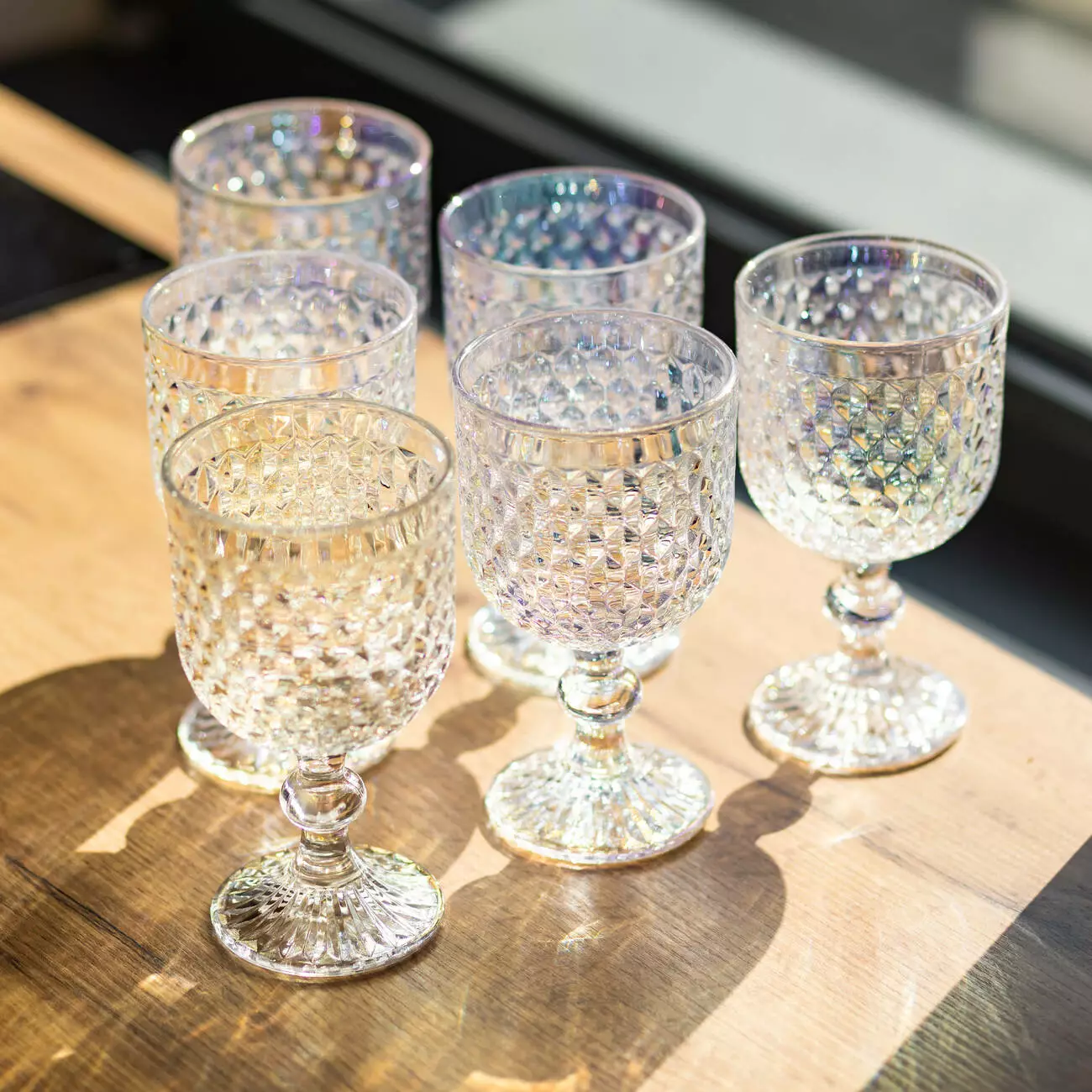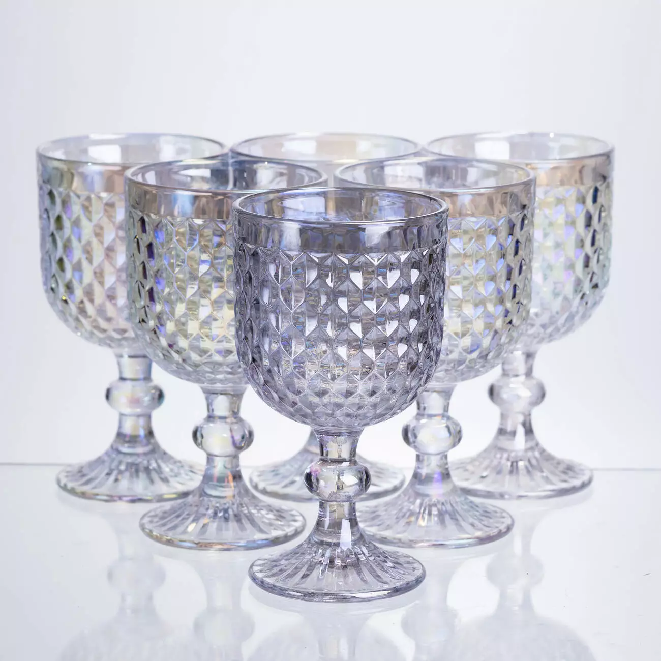 Келихи з рельєфною поверхнею виготовлені з якісного безсвинцевого скла, яке не вбирає запахи та не впливає на смак напоїв. Висота кожного келиха становить 16 см, діаметр — 8,5 см, а об’єм 300 мл оптимальний для подачі вина та інших напоїв, що вимагають збереження природного аромату. Така форма зручна для тримання та підкреслює подачу під час святкових або повсякденних трапез.