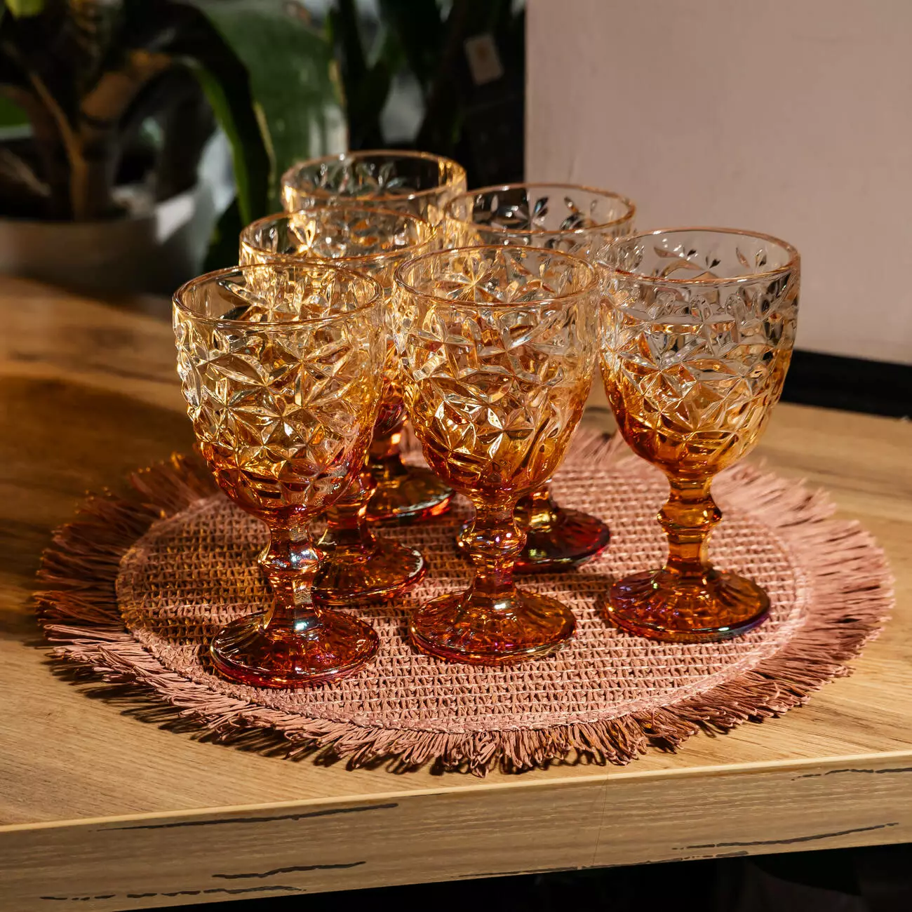 Висота 12 см і діаметр 10 см забезпечують зручний баланс у руці. Фактурна ніжка сприяє надійному захвату. Набір із 6 келихів підходить для щоденного використання та подачі напоїв під час зустрічей із гостями.