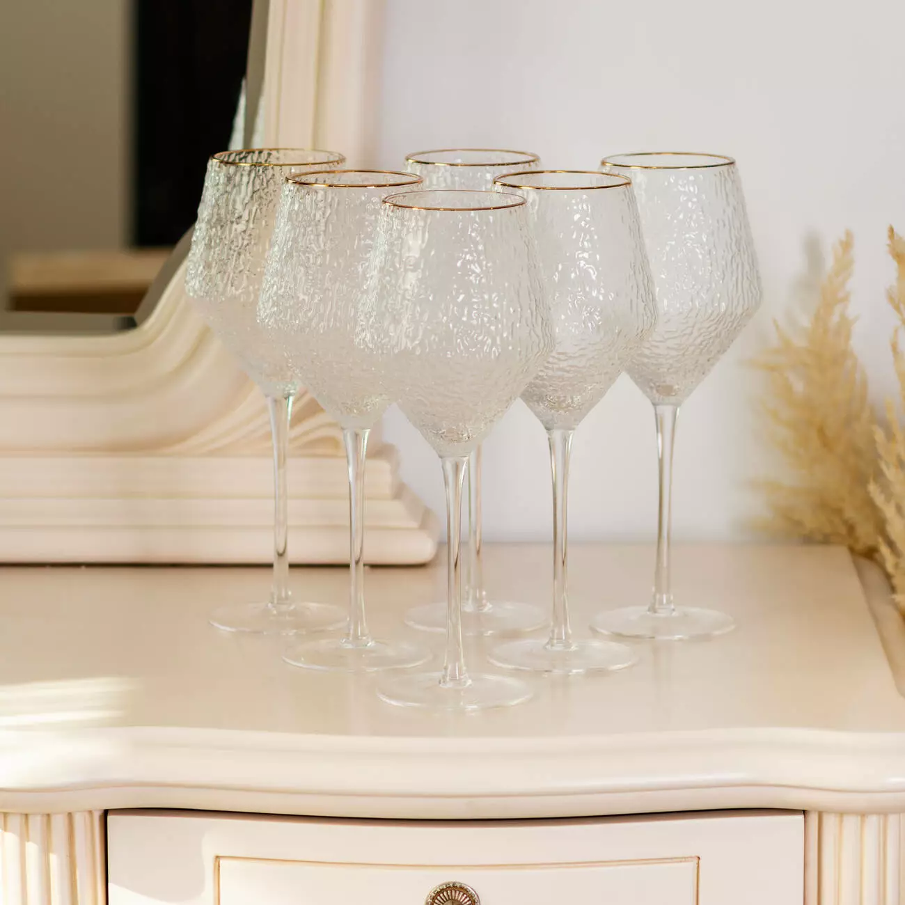 Набір келихів для вина Stunning включає шість великих фактурних келихів, які поєднують у собі сучасний стиль і вишукану елегантність. Виготовлені зі скла з текстурованою поверхнею, вони створюють цікаву гру світла та додають особливий акцент сервування столу. Золотий обідок підкреслює витонченість келихів, надаючи їм розкішного вигляду, що ідеально підходить для святкових або урочистих подій.