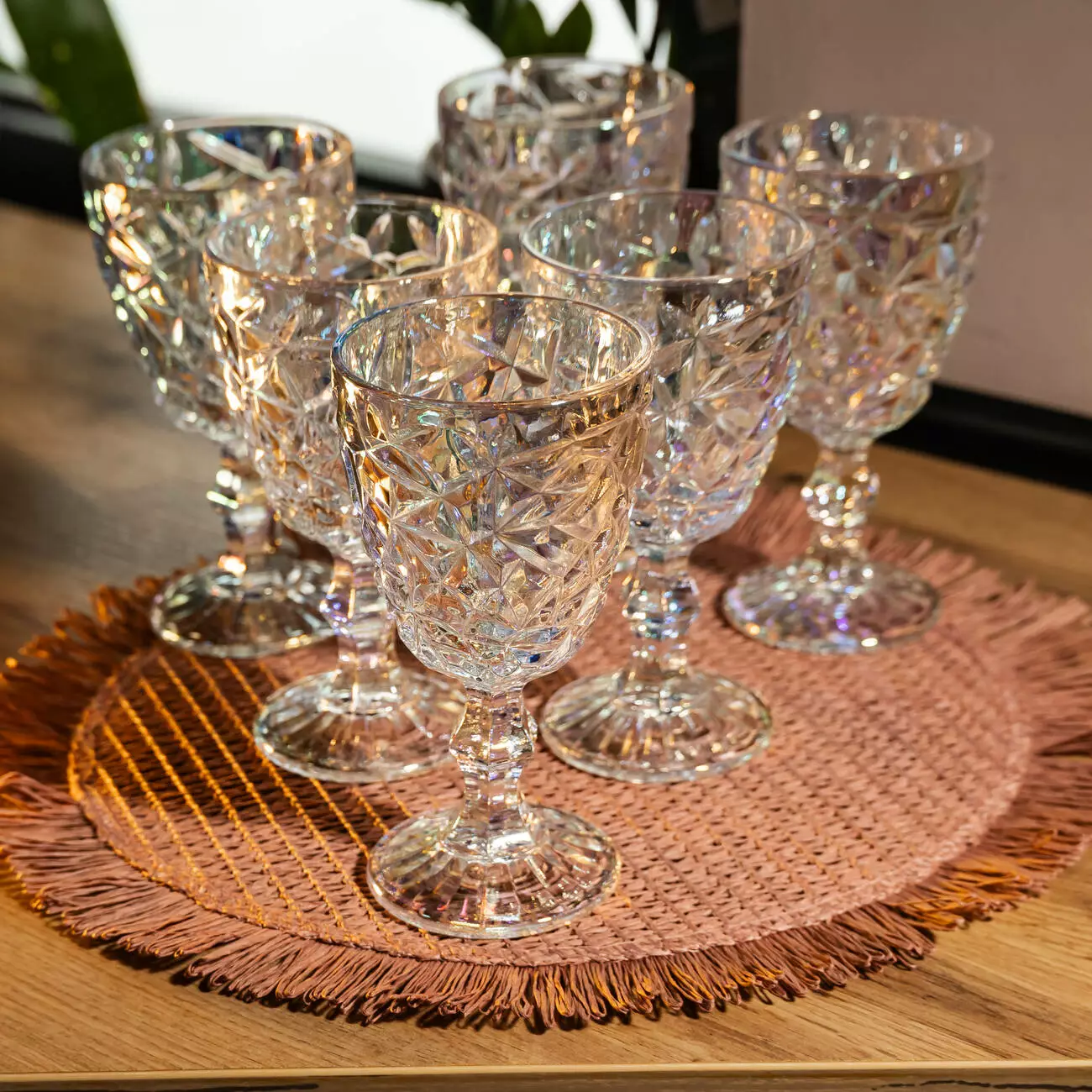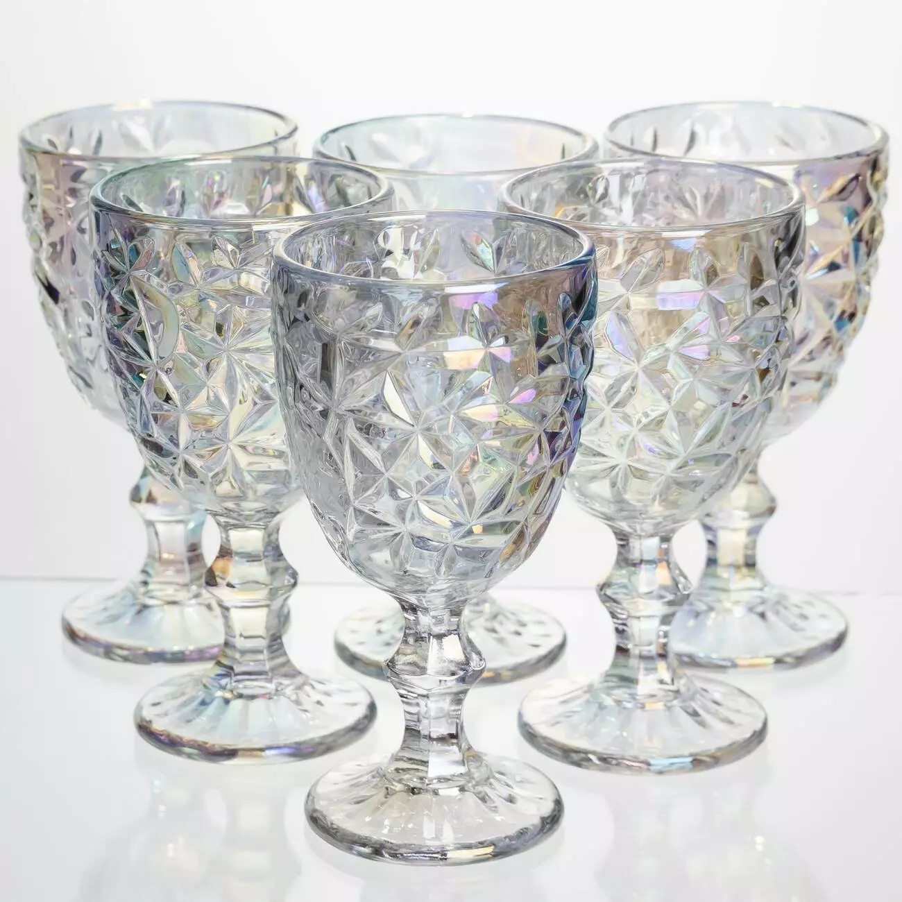 Набір келихів по 240 мл з фактурним візерунком та райдужною іризацією - елегантний та практичний комплект для святкового та повсякденного сервірування. Об'єм 240 мл оптимальний для вина, безалкогольних напоїв та порційних коктейлів.