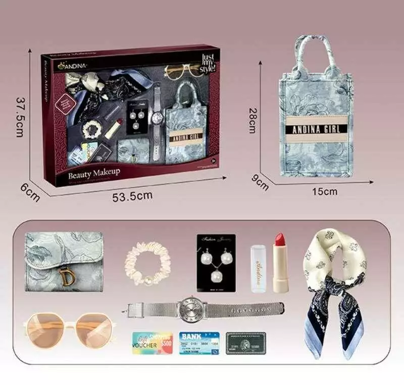 Набір аксесуарів 676-4 (24) функціональний годинник, сумочка, хустка, окуляри, гаманець, прикраси, імітація косметики, резинка, в коробці