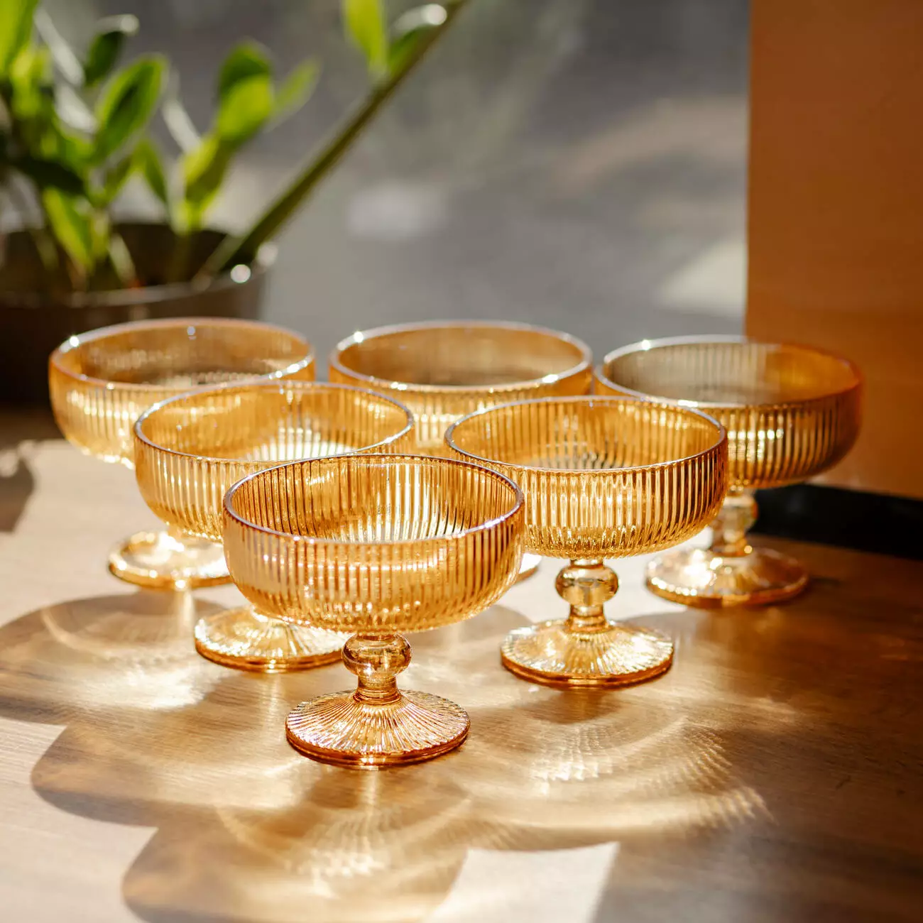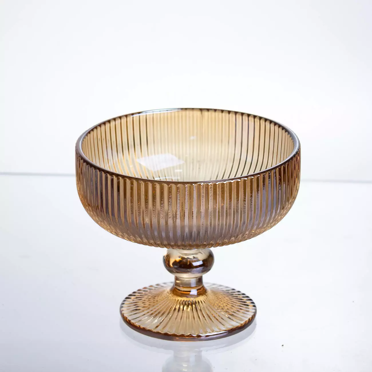Поверхня чаші та основи прикрашена вертикальним ребристим візерунком, що створює гру світла та додає виробу виразності. Чаша широка і відкрита, що дозволяє комфортно подавати десерти, а текстура підкреслює стиль та елегантність креманки.