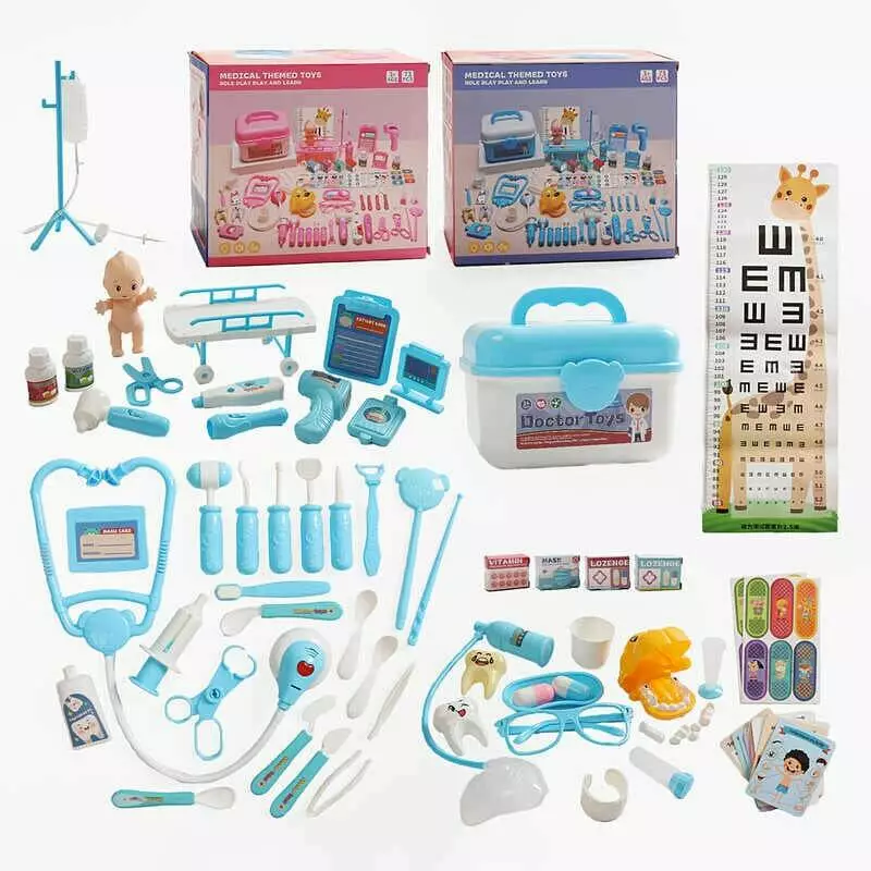 Набір лікаря 839-021 (48) 2 види, 73 ел, пупсик, бокс, окуляри, стетоскоп, звук серцебиття, підсвіч, термометр, молоточок, мед. приладдя, в коробці