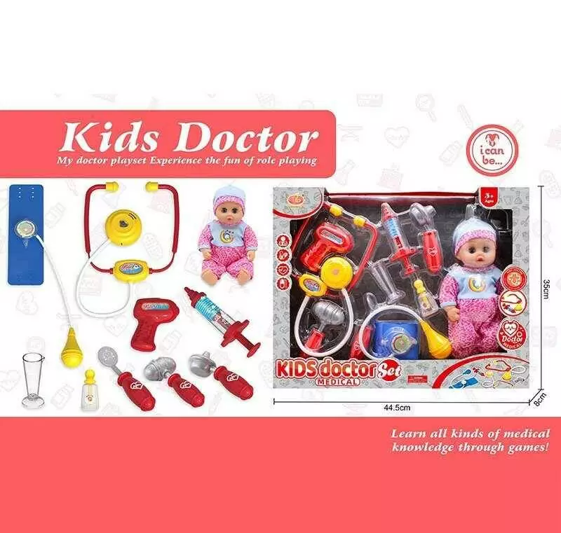 Набір лікаря KJ 1925 A-4 (24/2) стетоскоп, термометр, молоточок, дзеркало, мірна склянка, шприц, тонометр, отоскоп, висота пупсика: 26 см, в коробці