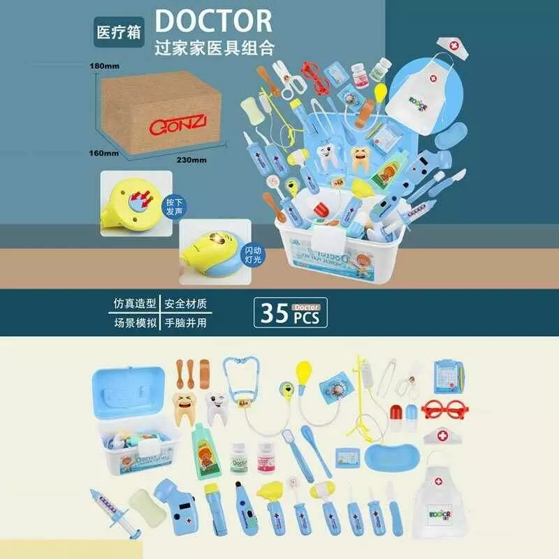 Набір лікаря QB 183-11 (12) 35 ел., фартух, окуляри, муляжі ліків, світло, термометр, пульсометр, отоскоп, ліхтарик, стетоскоп,звук,в боксі, в коробці