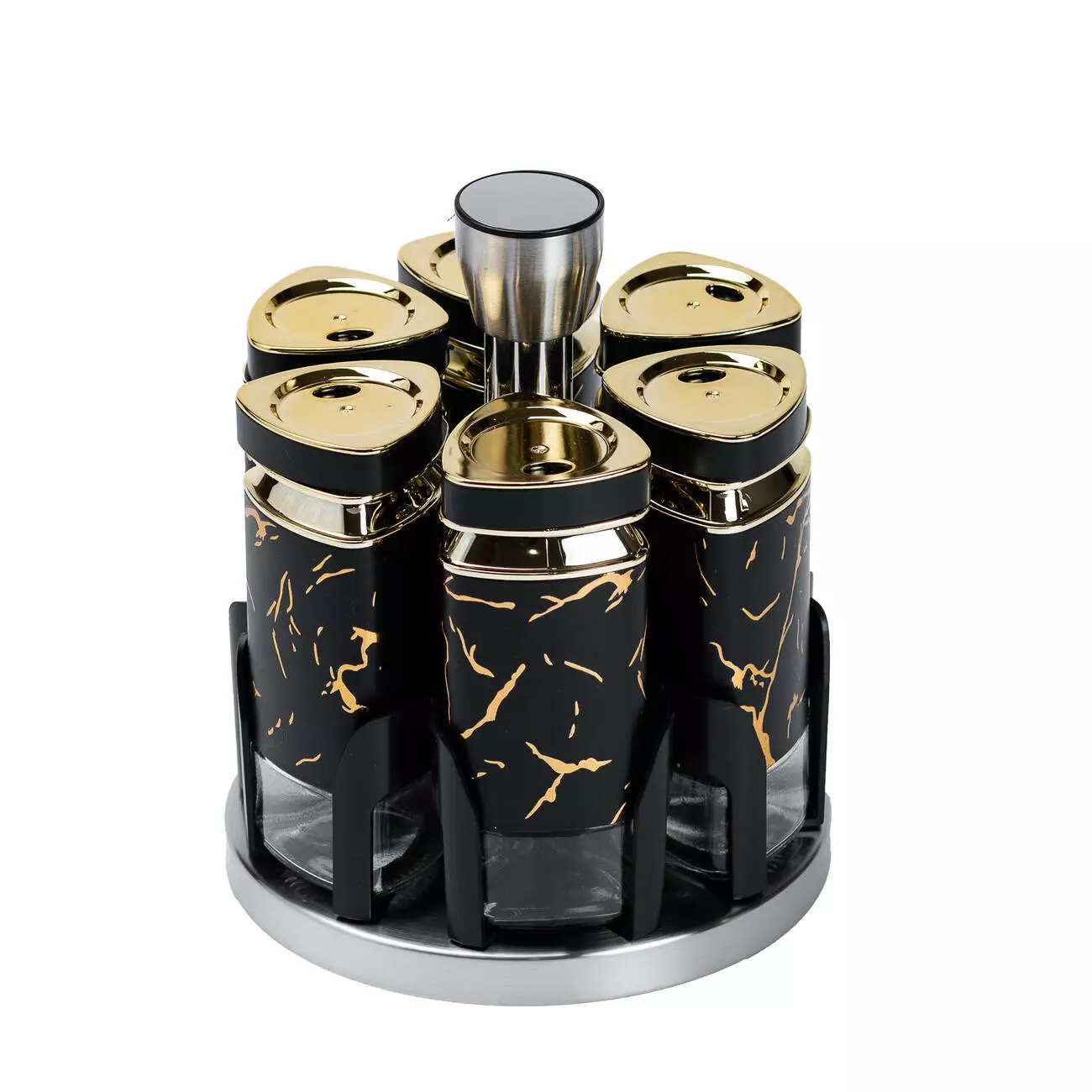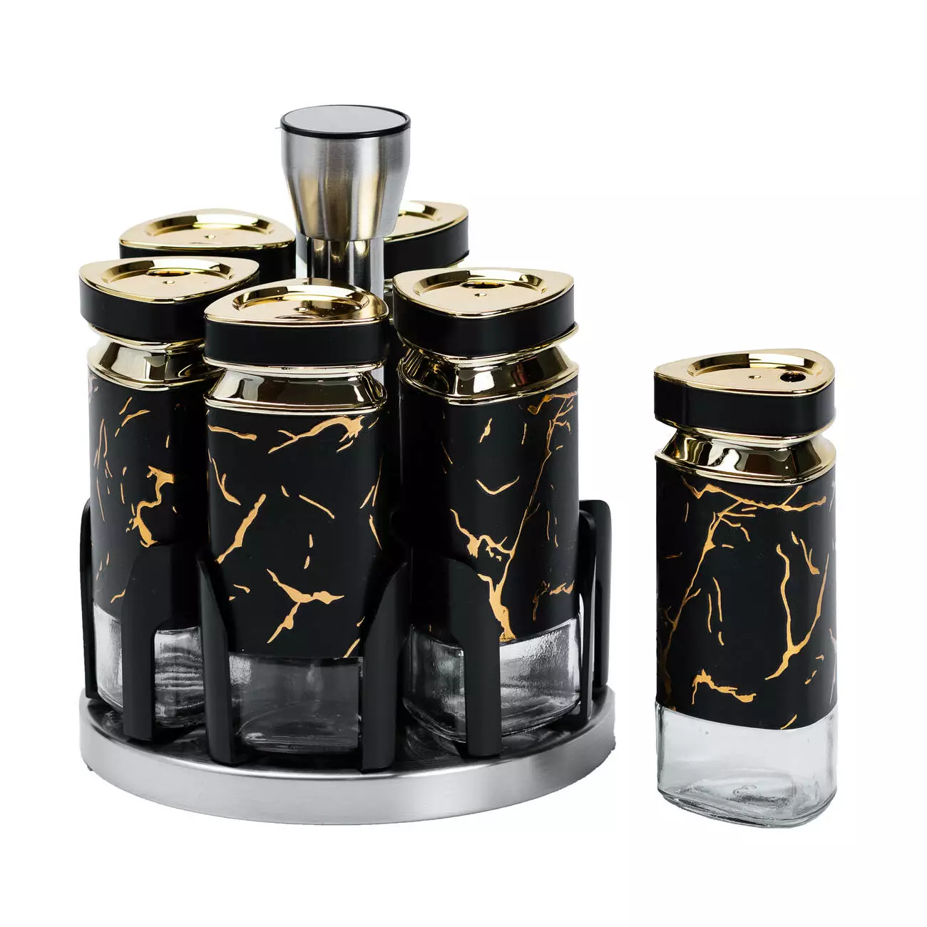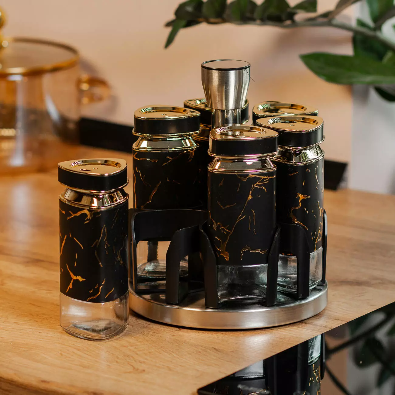 Металева підставка додає набору елегантності та функціональності. Її міцна конструкція забезпечує стабільність і зручне розташування всіх 6 баночок, заощаджуючи простір на кухонних полицях. Мармуровий декор підставки гармонійно вписується в будь-який інтер’єр, додаючи нотку розкоші та сучасного стилю.